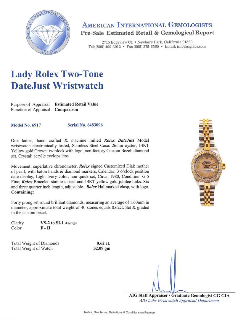 One ladies, hand crafted & machine milled Rolex DateJust Model wristwatch electronically tested, Stainless Steel Case: 26mm oyster, 14KT Yellow gold Crown: twinlock with logo, non-factory Custom Bezel: diamond set, Crystal: acrylic cyclops lens. Movement: superlative chronometer, Rolex signed Customized Dial: mother of pearl, with baton hands & diamond markers, Calendar: 3 o'clock position date display, Light Ivory color, non-quick set, Circa: 1980, Condition: G-5 Fine, Rolex Bracelet: stainless steel and 14KT yellow gold jubilee links. Six and three quarter inch length, adjustable. Rolex Hallmarked clasp, with logo. Containing: Forty prong set round brilliant diamonds, measuring an average of 1.60mm in diameter, approximate total weight of 40 stones equals 0.62ct. Set & graded in the custom bezel. Clarity: VS-2 to SI-1 Average. Color: F - H. Total Weight of Diamonds 0.62ct. Total Weight of Watch 52.09gm. AIG Appraised.