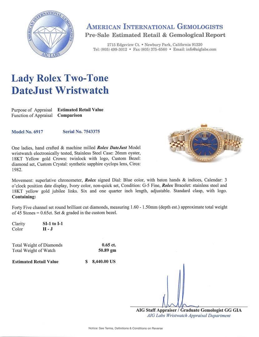 One ladies, hand crafted & machine milled Rolex DateJust Model wristwatch electronically tested, Stainless Steel Case: 26mm oyster, 18KT Yellow gold Crown: twinlock with logo, Custom Bezel: diamond set, Custom Crystal: synthetic sapphire cyclops lens, Circa: 1982.Movement: superlative chronometer, Rolex signed Dial: Blue color, with baton hands & indices, Calendar: 3 o'clock position date display, Ivory color, non-quick set, Condition: G-5 Fine, Rolex Bracelet: stainless steel and 18KT yellow gold jubilee links. Six and one quarter inch length, adjustable. Standard clasp, with logo. Containing: Forty Five channel set round brilliant cut diamonds, measuring 1.60 - 1.50mm (depth est.) approximate total weight of 45 Stones = 0.65ct. Set & graded in the custom bezel. Clarity: SI-1 to I-1. Color: H - J. Total Weight of Diamonds 0.65ct. Total Weight of Watch 50.89gm. AIG Appraised at $8,440.00.