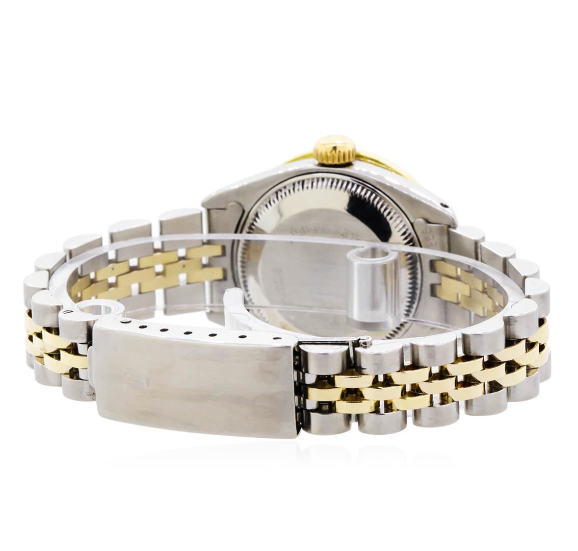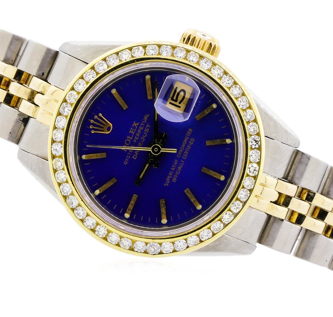 One ladies, hand crafted & machine milled Rolex DateJust Model wristwatch electronically tested, Stainless Steel Case: 26mm oyster, 18KT Yellow gold Crown: twinlock with logo, Custom Bezel: diamond set, Custom Crystal: synthetic sapphire cyclops lens, Circa: 1982.Movement: superlative chronometer, Rolex signed Dial: Blue color, with baton hands & indices, Calendar: 3 o'clock position date display, Ivory color, non-quick set, Condition: G-5 Fine, Rolex Bracelet: stainless steel and 18KT yellow gold jubilee links. Six and one quarter inch length, adjustable. Standard clasp, with logo. Containing: Forty Five channel set round brilliant cut diamonds, measuring 1.60 - 1.50mm (depth est.) approximate total weight of 45 Stones = 0.65ct. Set & graded in the custom bezel. Clarity: SI-1 to I-1. Color: H - J. Total Weight of Diamonds 0.65ct. Total Weight of Watch 50.89gm. AIG Appraised at $8,440.00.