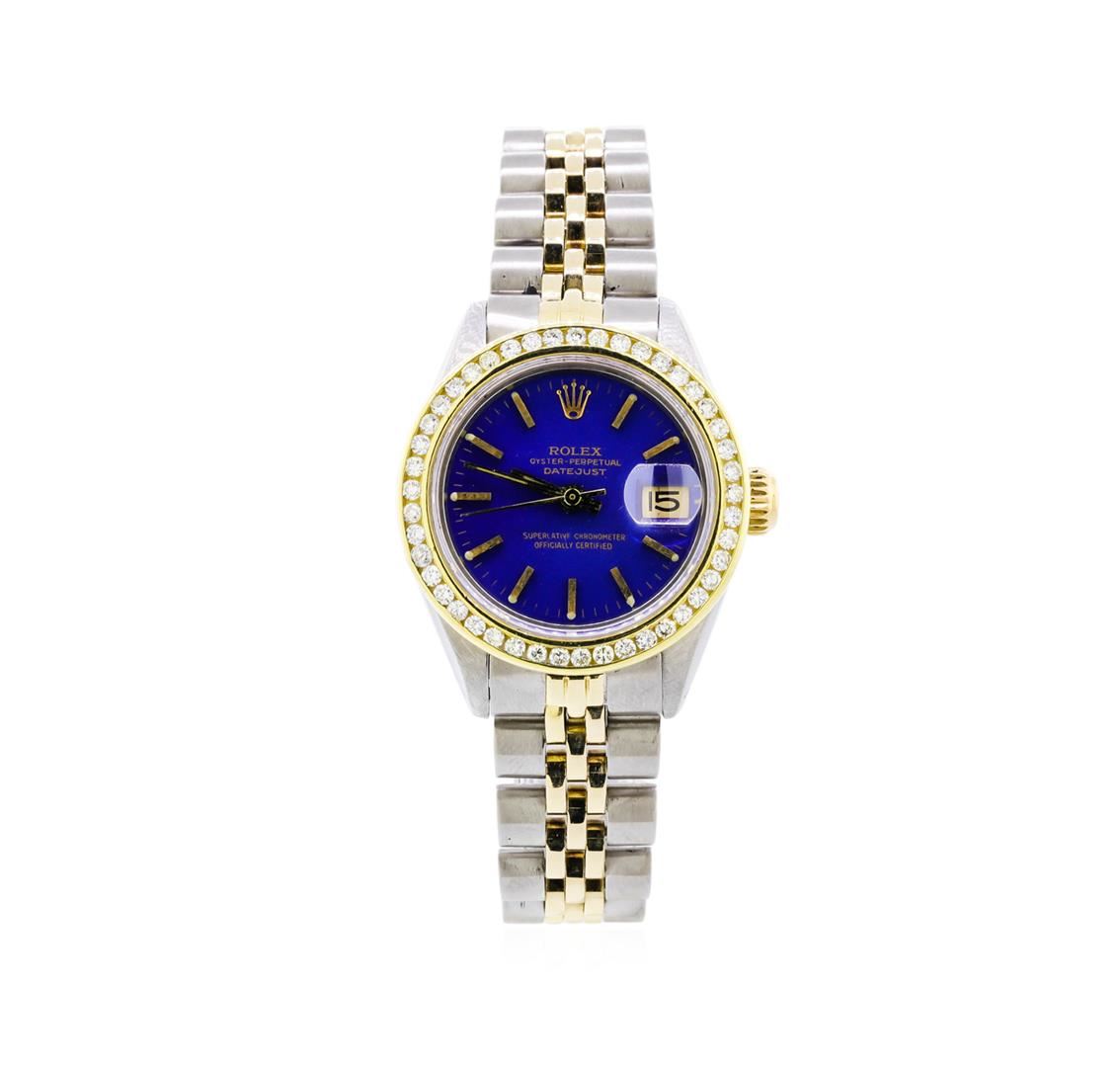 One ladies, hand crafted & machine milled Rolex DateJust Model wristwatch electronically tested, Stainless Steel Case: 26mm oyster, 18KT Yellow gold Crown: twinlock with logo, Custom Bezel: diamond set, Custom Crystal: synthetic sapphire cyclops lens, Circa: 1982.Movement: superlative chronometer, Rolex signed Dial: Blue color, with baton hands & indices, Calendar: 3 o'clock position date display, Ivory color, non-quick set, Condition: G-5 Fine, Rolex Bracelet: stainless steel and 18KT yellow gold jubilee links. Six and one quarter inch length, adjustable. Standard clasp, with logo. Containing: Forty Five channel set round brilliant cut diamonds, measuring 1.60 - 1.50mm (depth est.) approximate total weight of 45 Stones = 0.65ct. Set & graded in the custom bezel. Clarity: SI-1 to I-1. Color: H - J. Total Weight of Diamonds 0.65ct. Total Weight of Watch 50.89gm. AIG Appraised at $8,440.00.