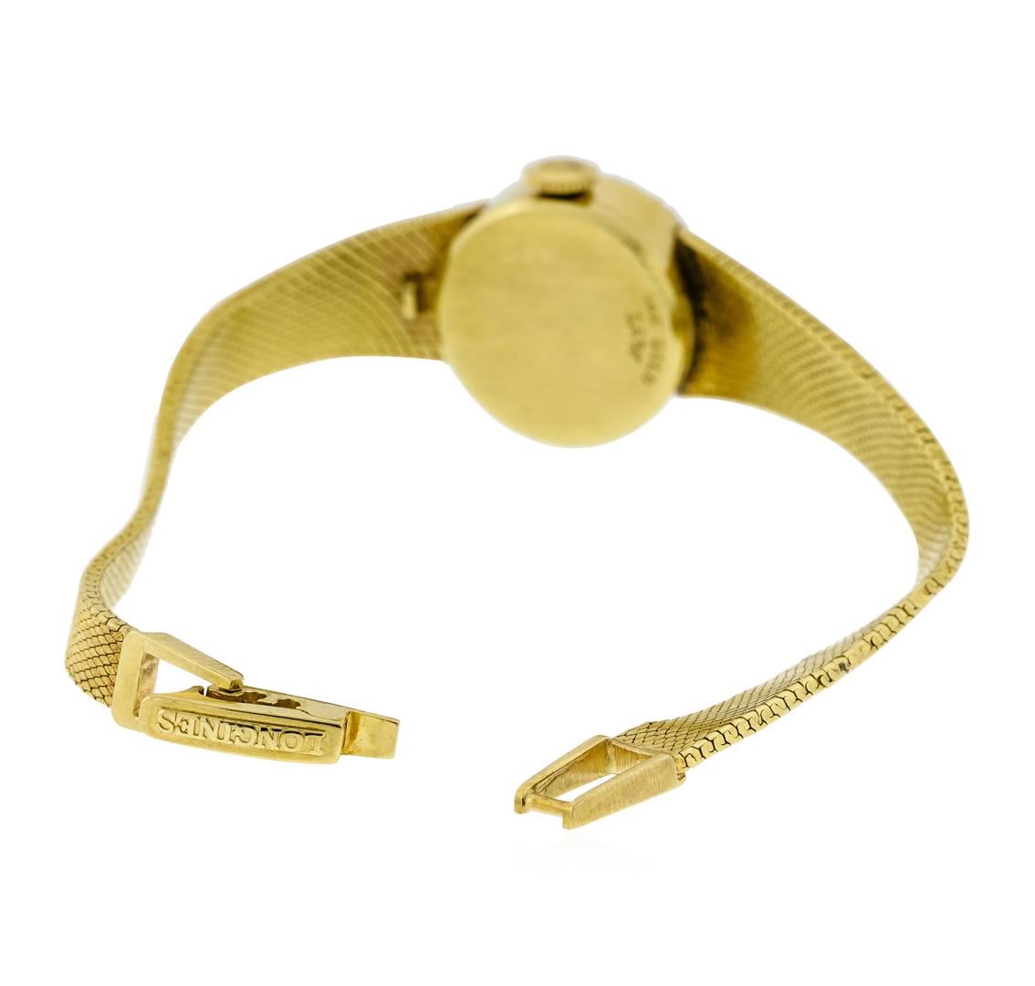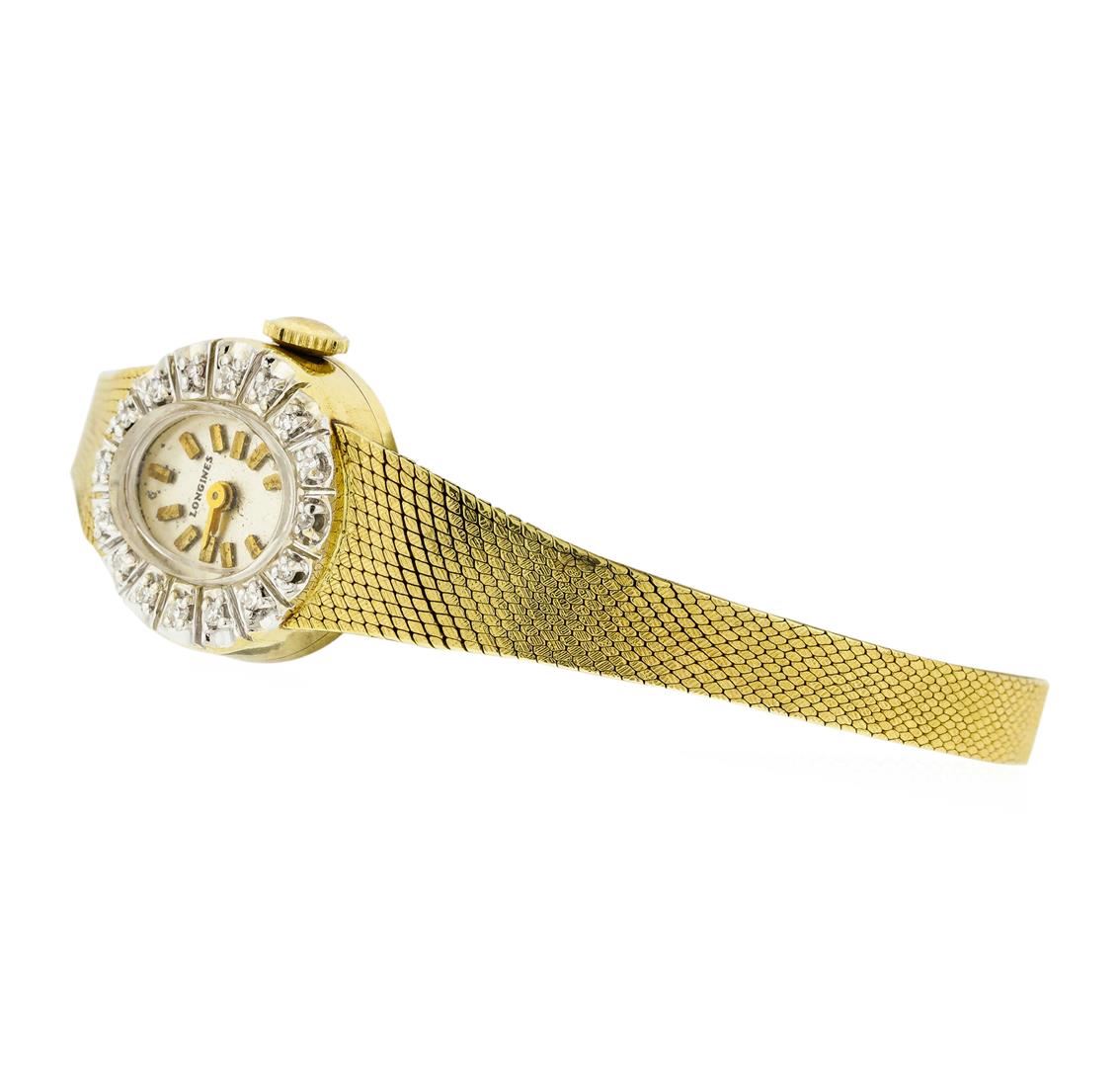 One Ladies Longines 14K Vintage Wristwatch with Diamond Bezel. Case: 14K Yellow Gold, Bezel: 14K Yellow Gold with 15 diamonds and an approximate total weight of .10ctw, Dial: Silver with Gold Stick Markers Bracelet: 14K Yellow Gold, approximately 6 inches in length, the clasp is stamped with "Longines". The watch is in good working condition.