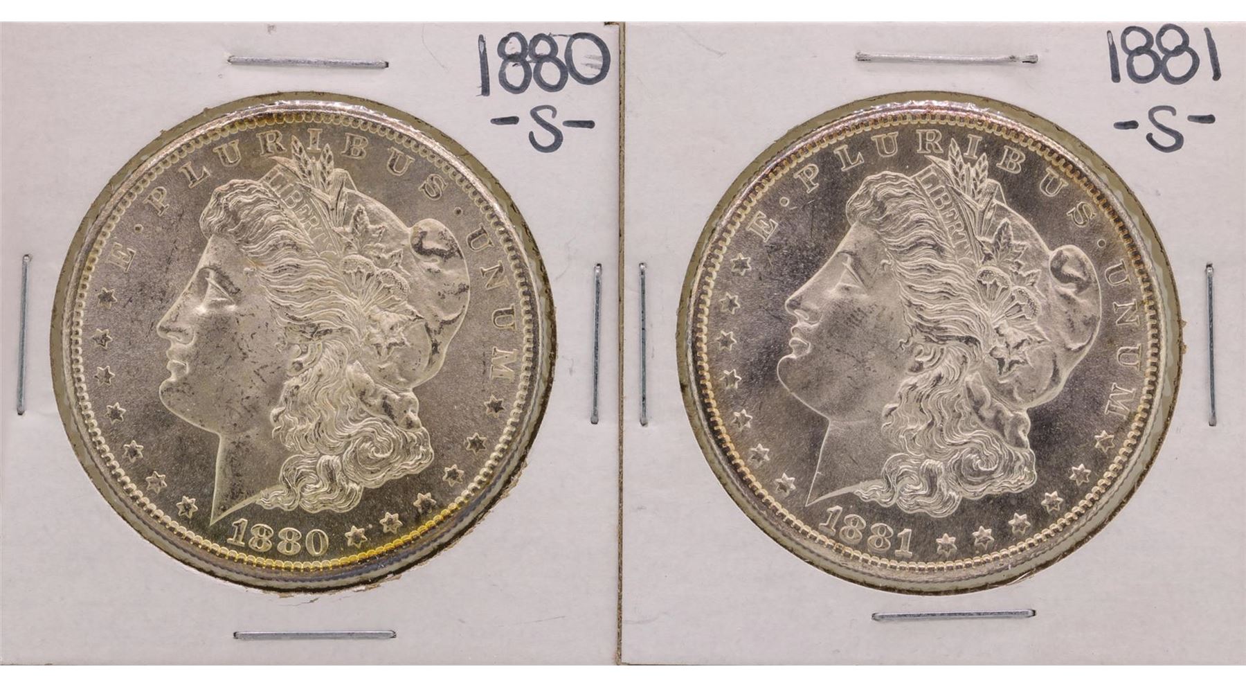 One Lot 1880-S & 1881-S $1 Morgan Silver Dollar Coins.