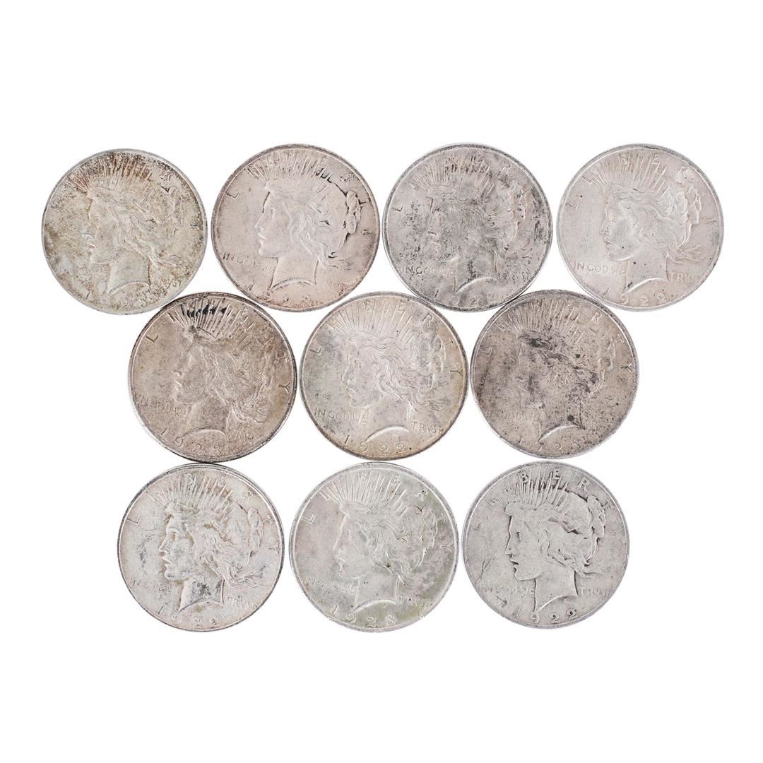 One Lot of (10) $1 Peace Silver Dollar Coins.