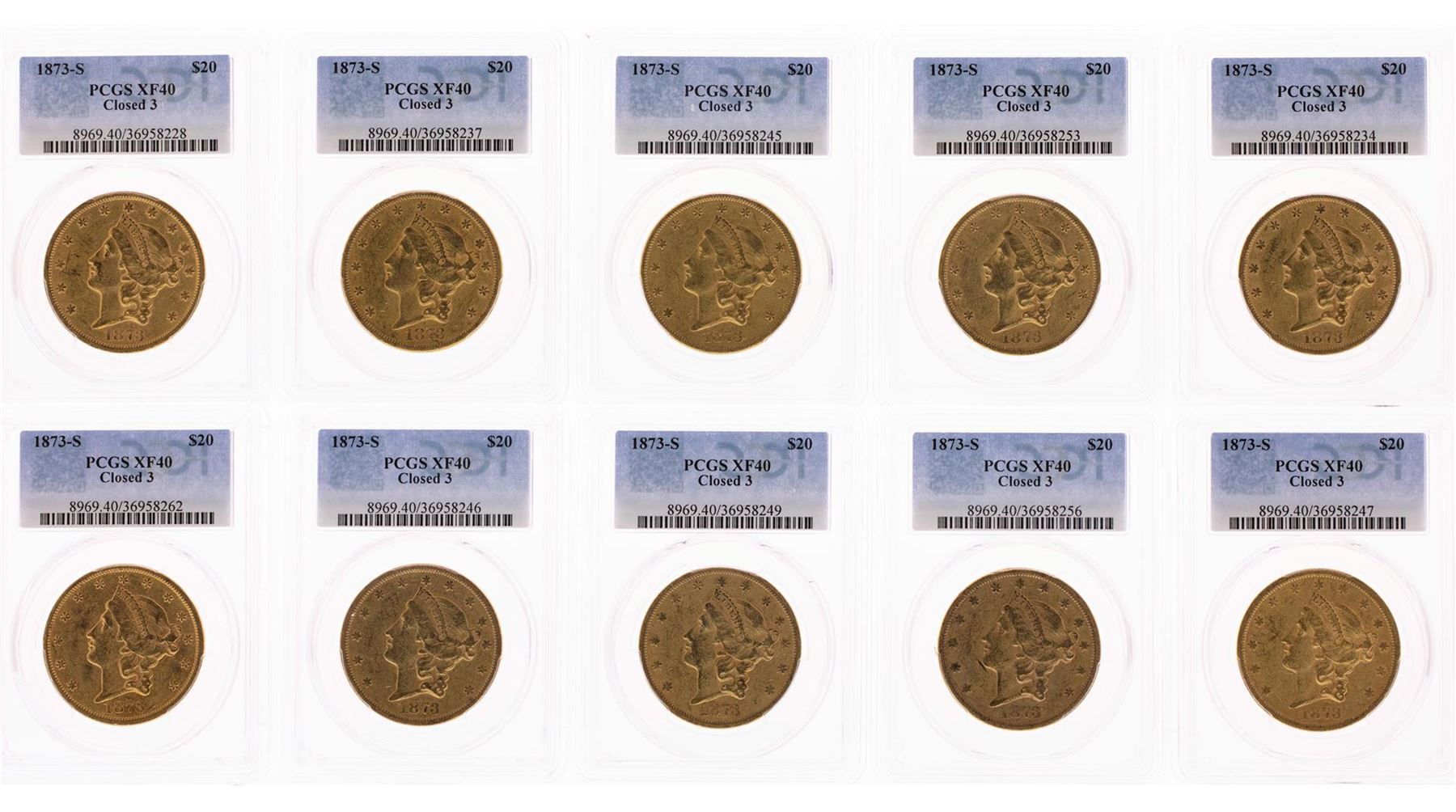 One Lot of (10) 1873-S Closed 3 $20 Liberty Head Double Eagle Gold Coins PCGS XF40. PCGS Graded.