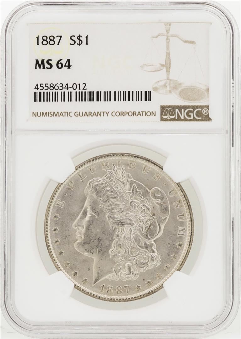 One Lot of (10) 1887 $1 Morgan Silver Dollar Coins NGC MS64. NGC Certified.