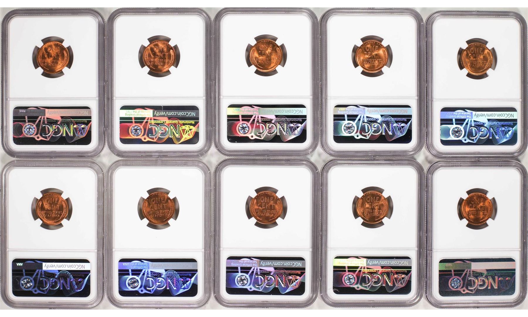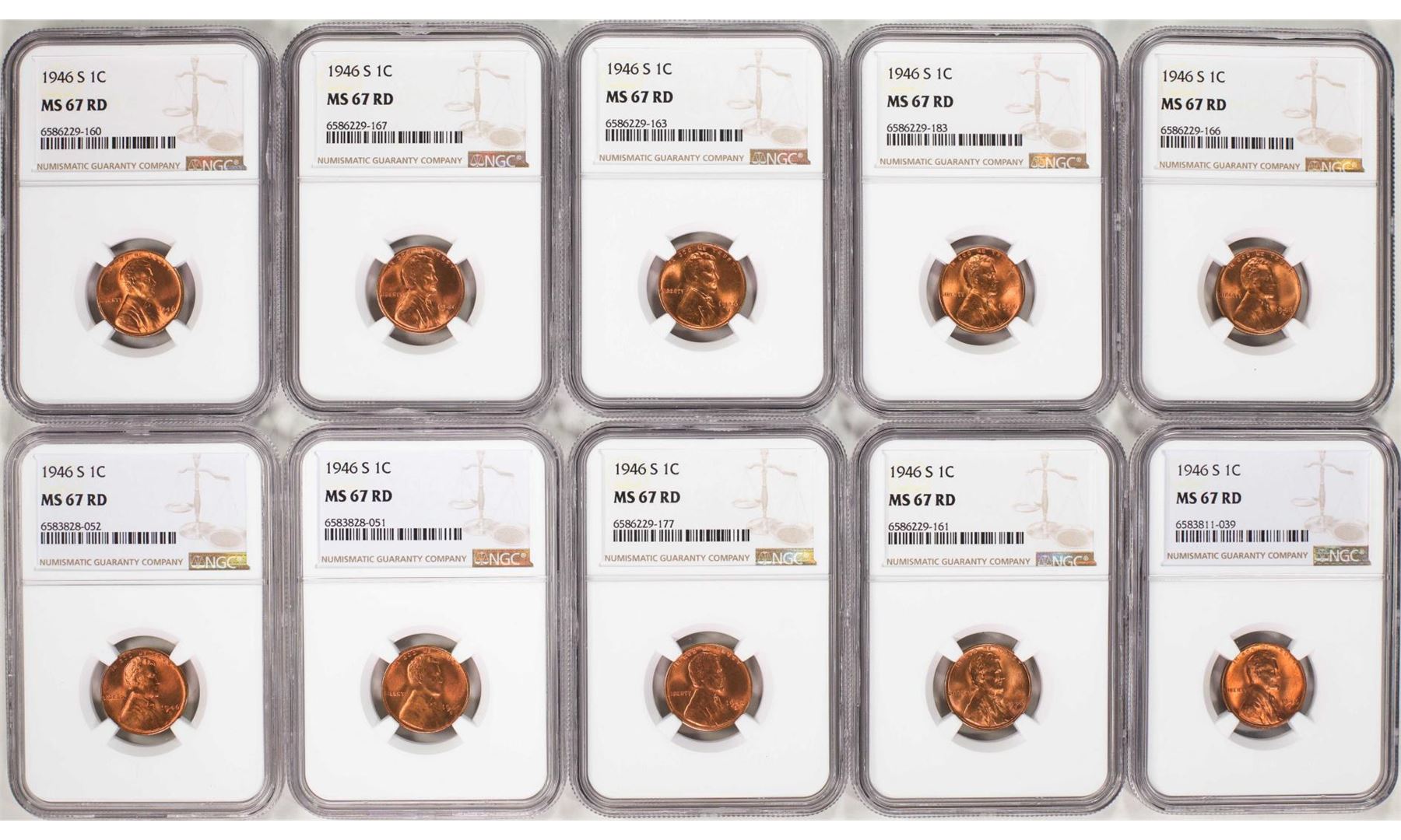 One Lot of (10) 1946-S Lincoln Wheat Cent Coins NGC MS67RD. NGC Certified.