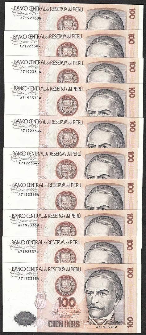 One Lot of (10) 1987 Peru Cien Intis Uncirculated Bank Notes.