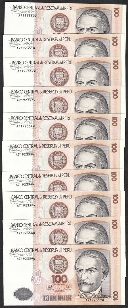 One Lot of (10) 1987 Peru Cien Intis Uncirculated Bank Notes.