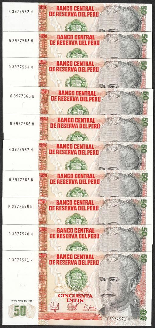 One Lot of (10) 1987 Peru Cincuenta Intis Uncirculated Bank Notes.