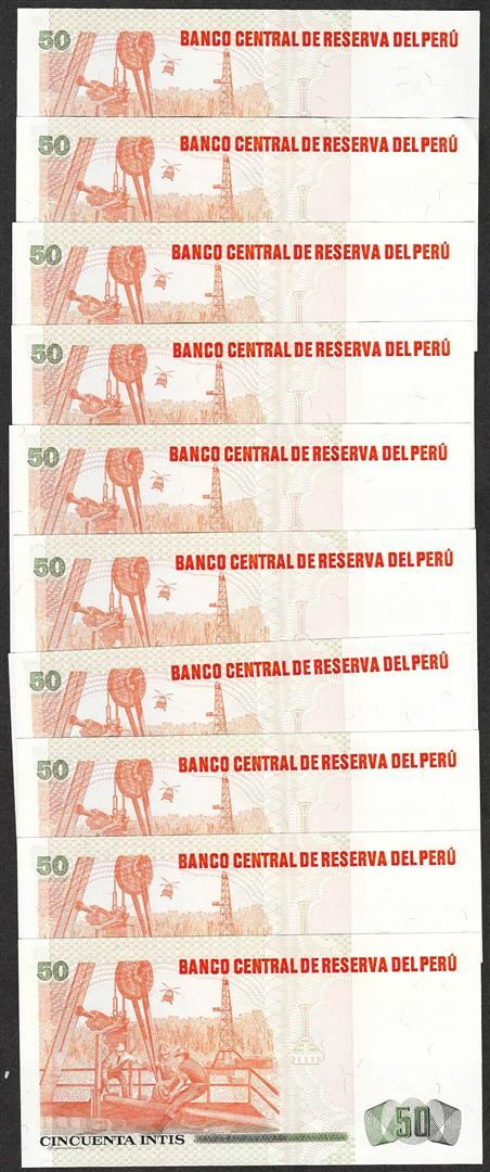 Lot of (10) 1987 Peru Cincuenta Intis Uncirculated Bank Notes