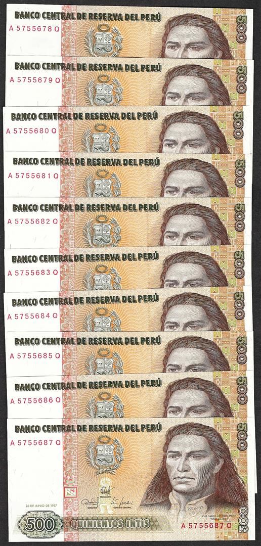 One Lot of (10) 1987 Peru Quinientos Intis Uncirculated Bank Notes.