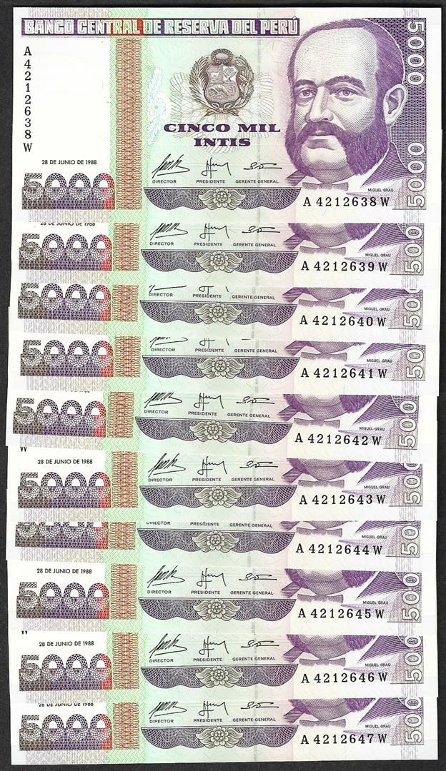 Lot of (10) 1988 Peru Cinco Mil Intis Uncirculated Bank Notes