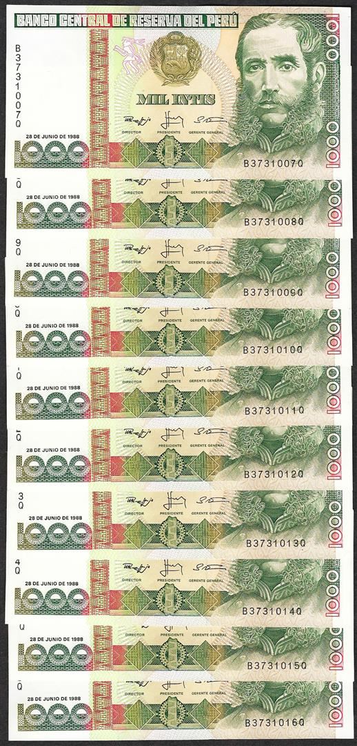 One Lot of (10) 1988 Peru Mil Intis Uncirculated Bank Notes.