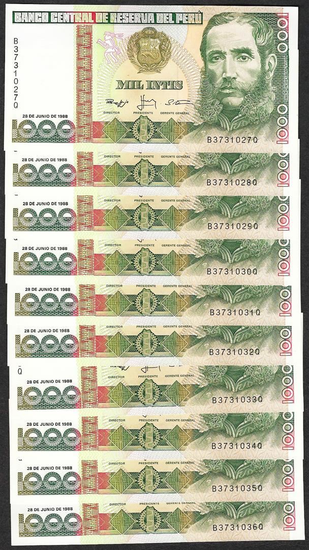 One Lot of (10) 1988 Peru Mil Intis Uncirculated Bank Notes.