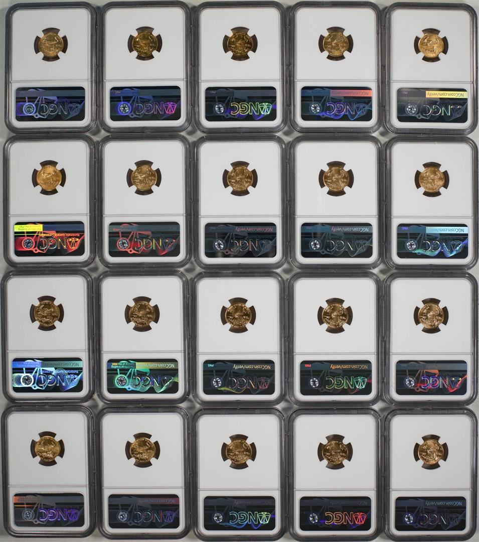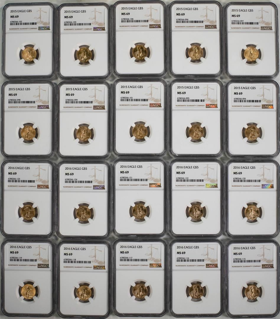 One Lot of (10) 2015 & (10) 2016 $5 American Gold Eagle Coins NGC MS69. NGC Certified.