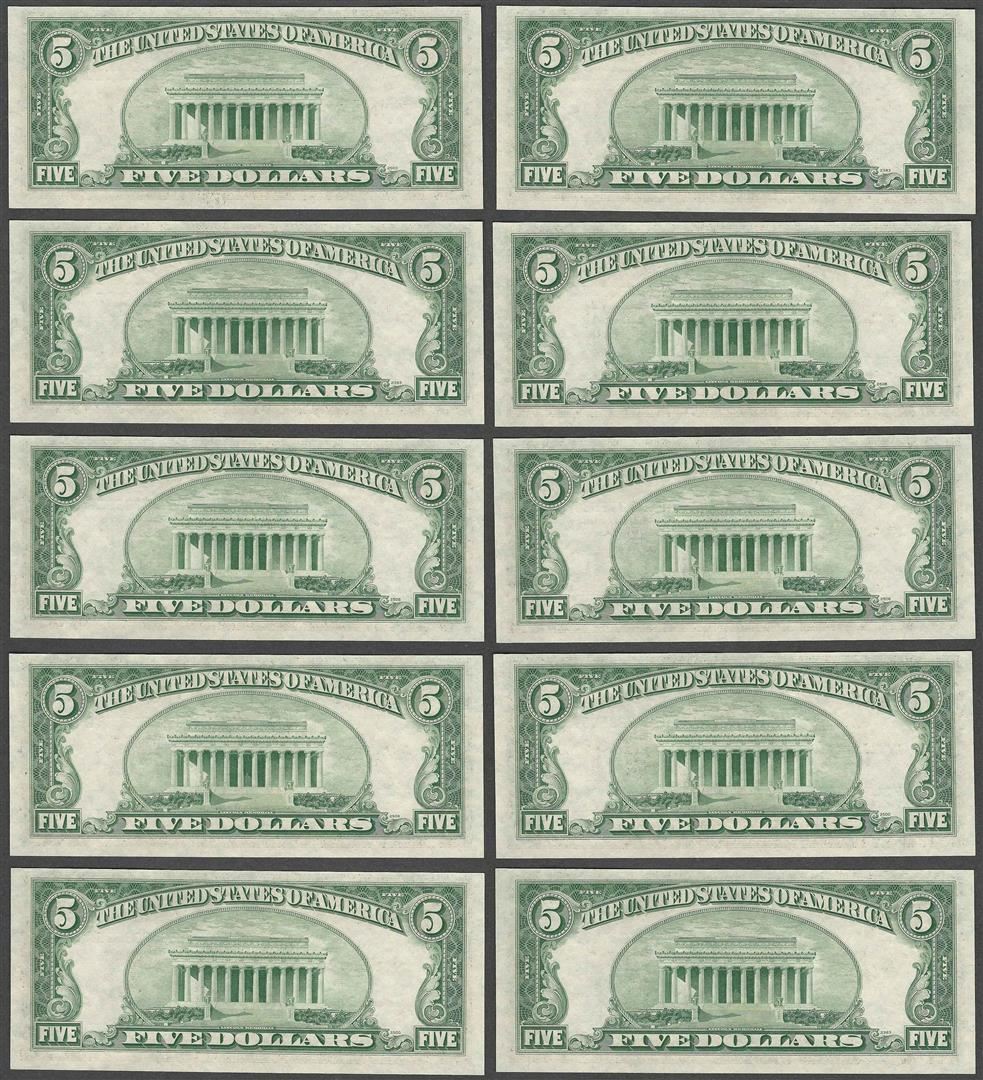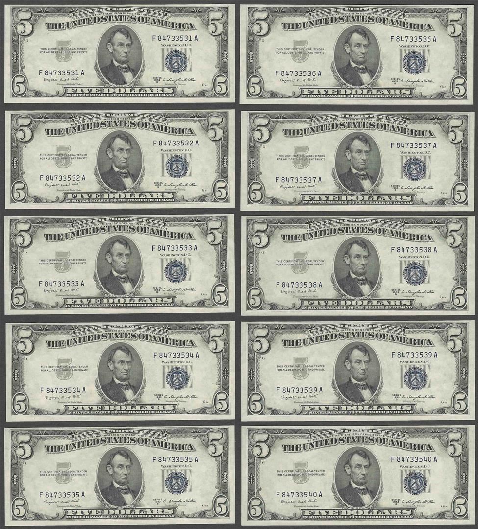 One Lot of (10) Consecutive 1953B $5 Silver Certificate Notes Gem Uncirculated.