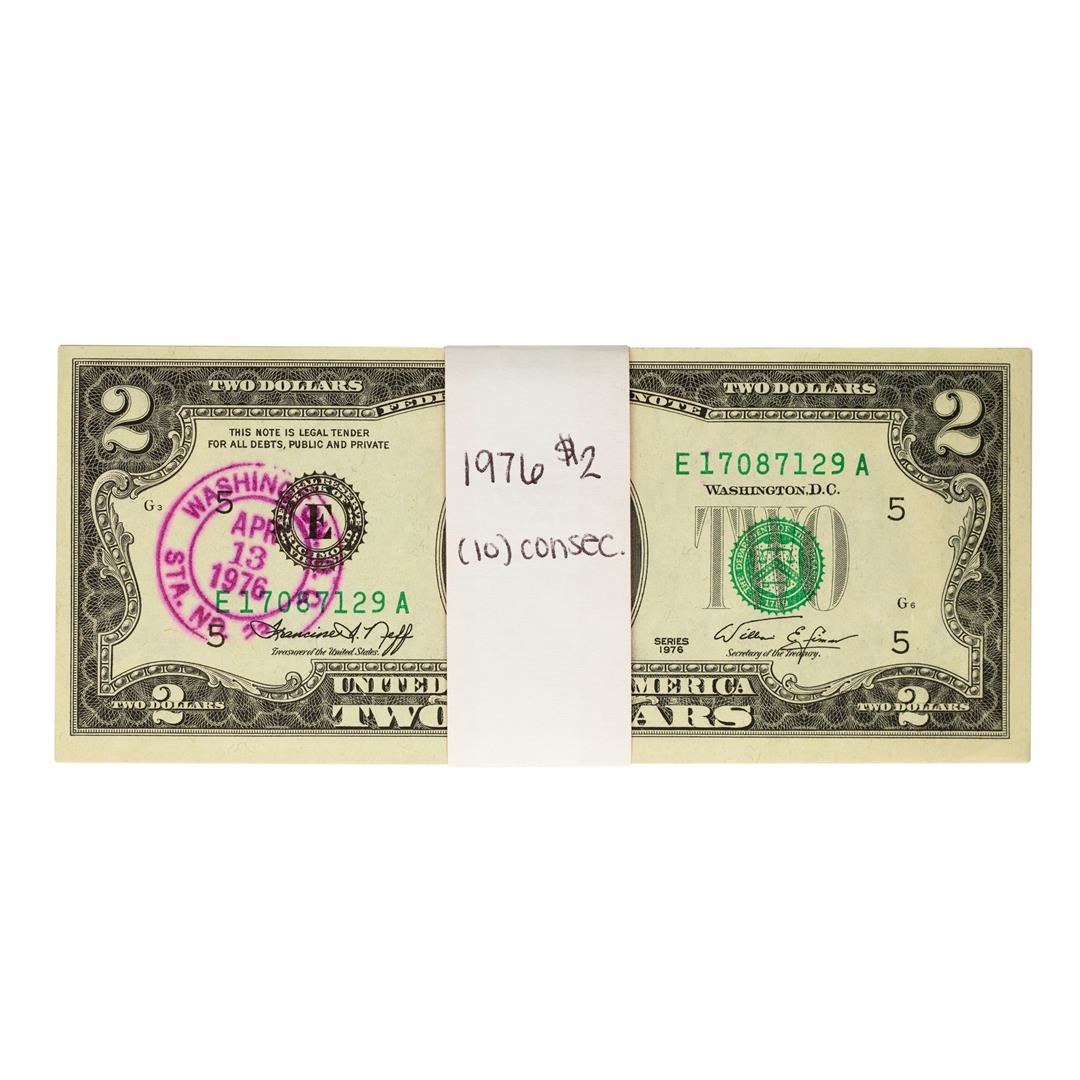 One Lot of (10) Consecutive 1976 $2 Federal Reserve Notes First Day Issue with Stamps.