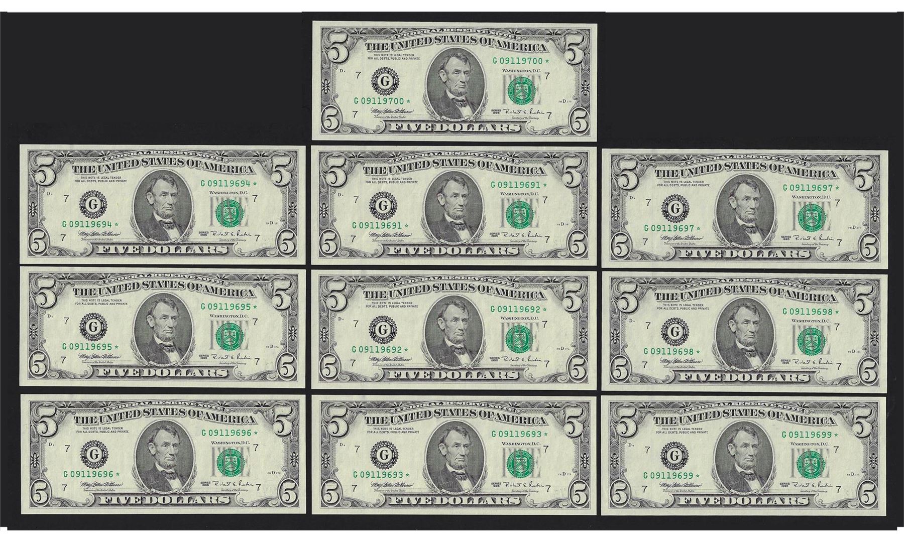 One Lot of (10) Consecutive 1995 $5 Federal Reserve STAR Notes.