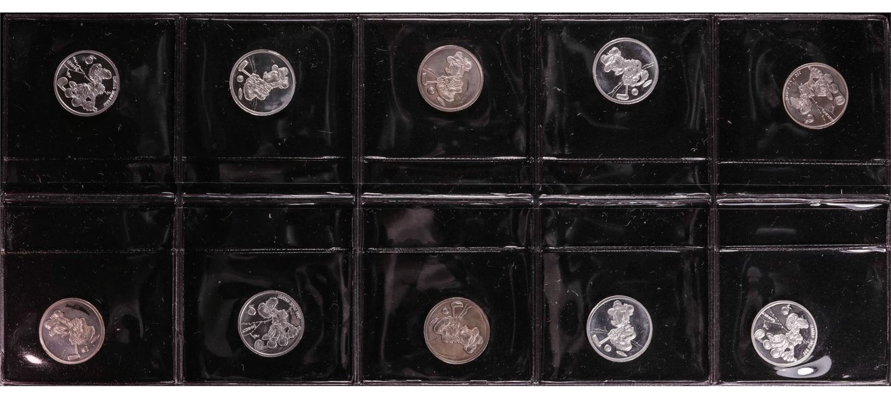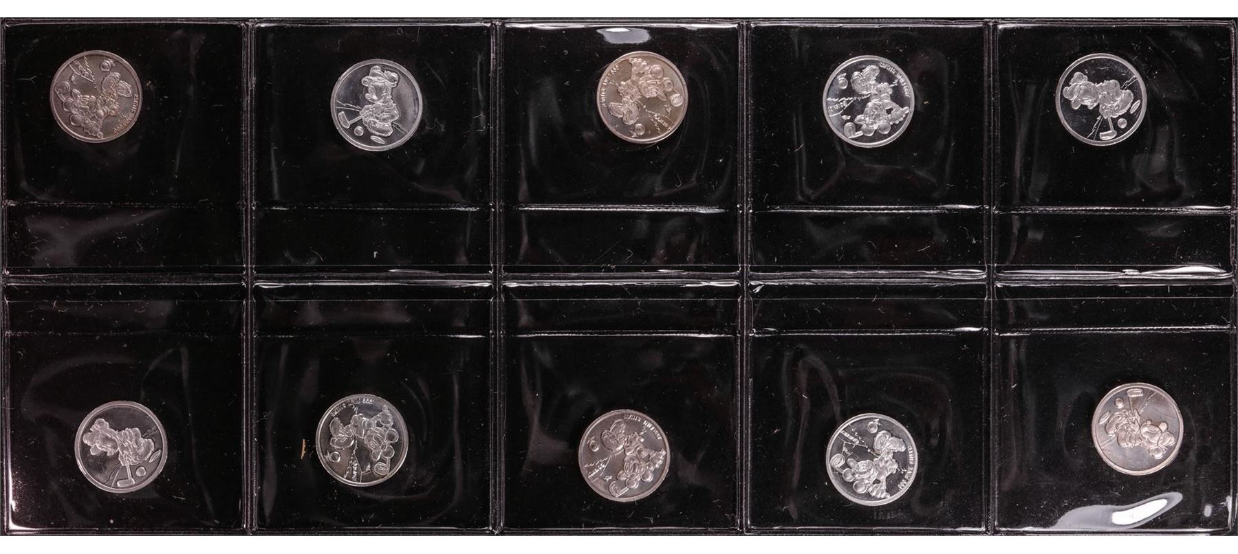 One Lot of (10) Disney Mickey & Minnie Mouse Golfer 1/20 oz. .999 Fine Silver Coin Rounds.