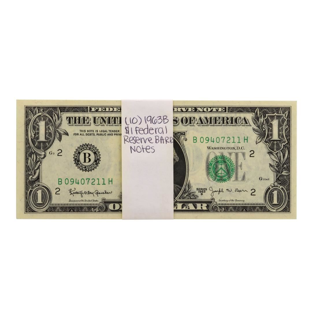 One Lot of (10) Uncirculated 1963B $1 Federal Reserve BARR Notes.