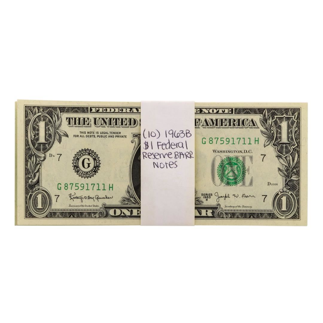 One Lot of (10) Uncirculated 1963B $1 Federal Reserve BARR Notes.