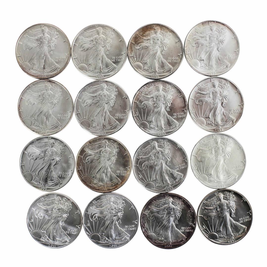 Lot of (16) Brilliant Uncirculated Mixed Date $1 American Silver Eagle Coins
