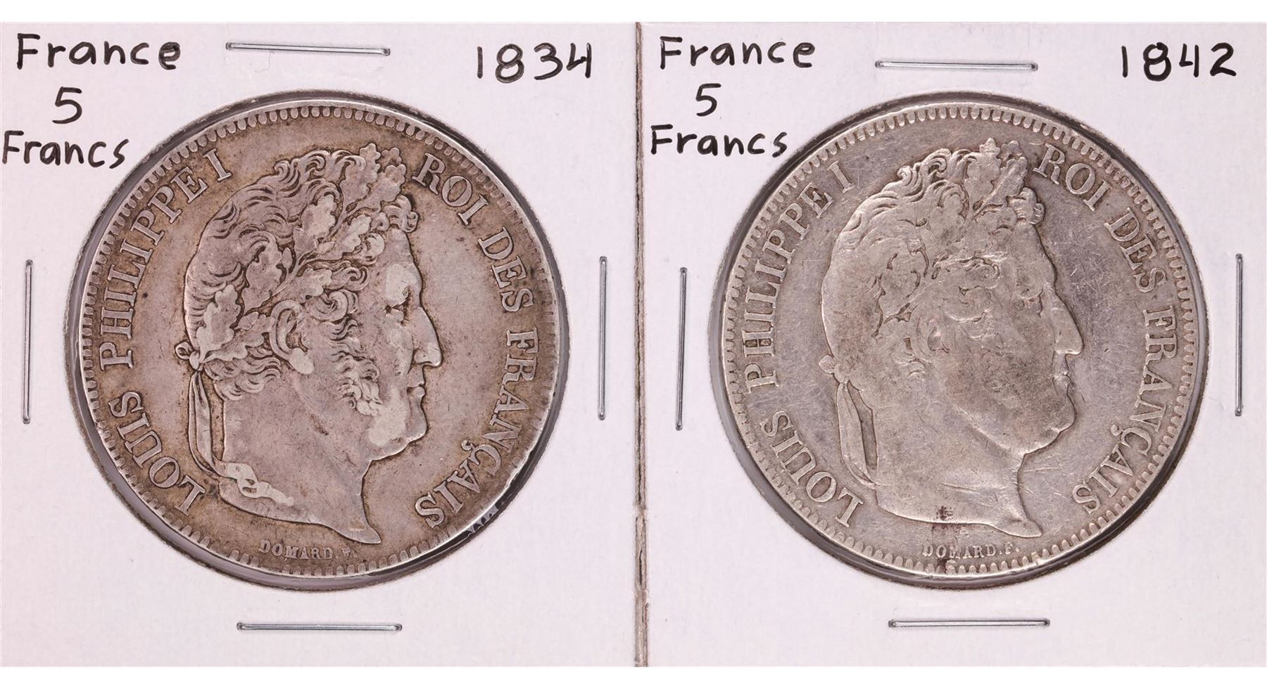 One Lot of 1834 & 1842 France 5 Francs Silver Coins.