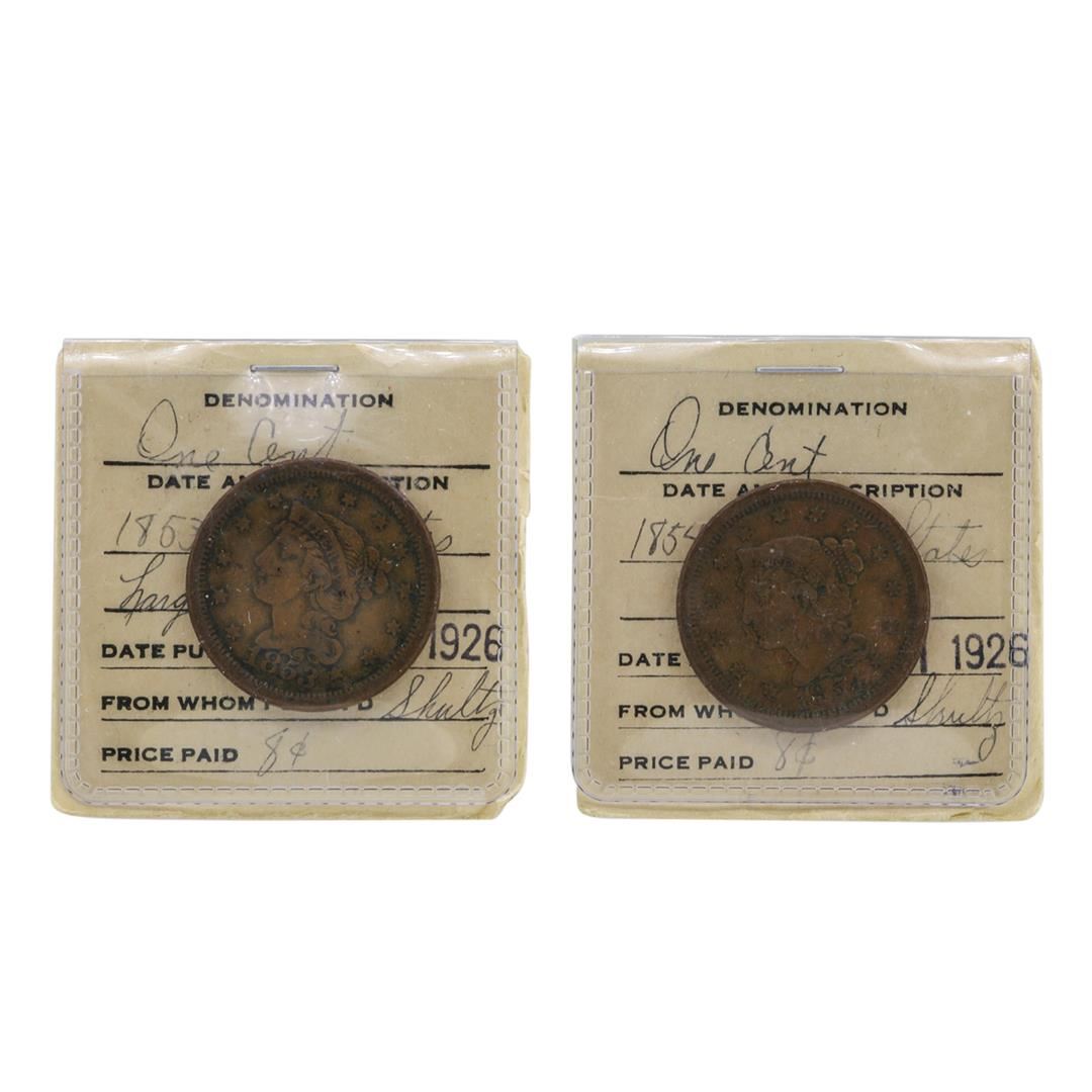 One Lot of 1853 & 1854 Large One Cent Coins in Old Flip.