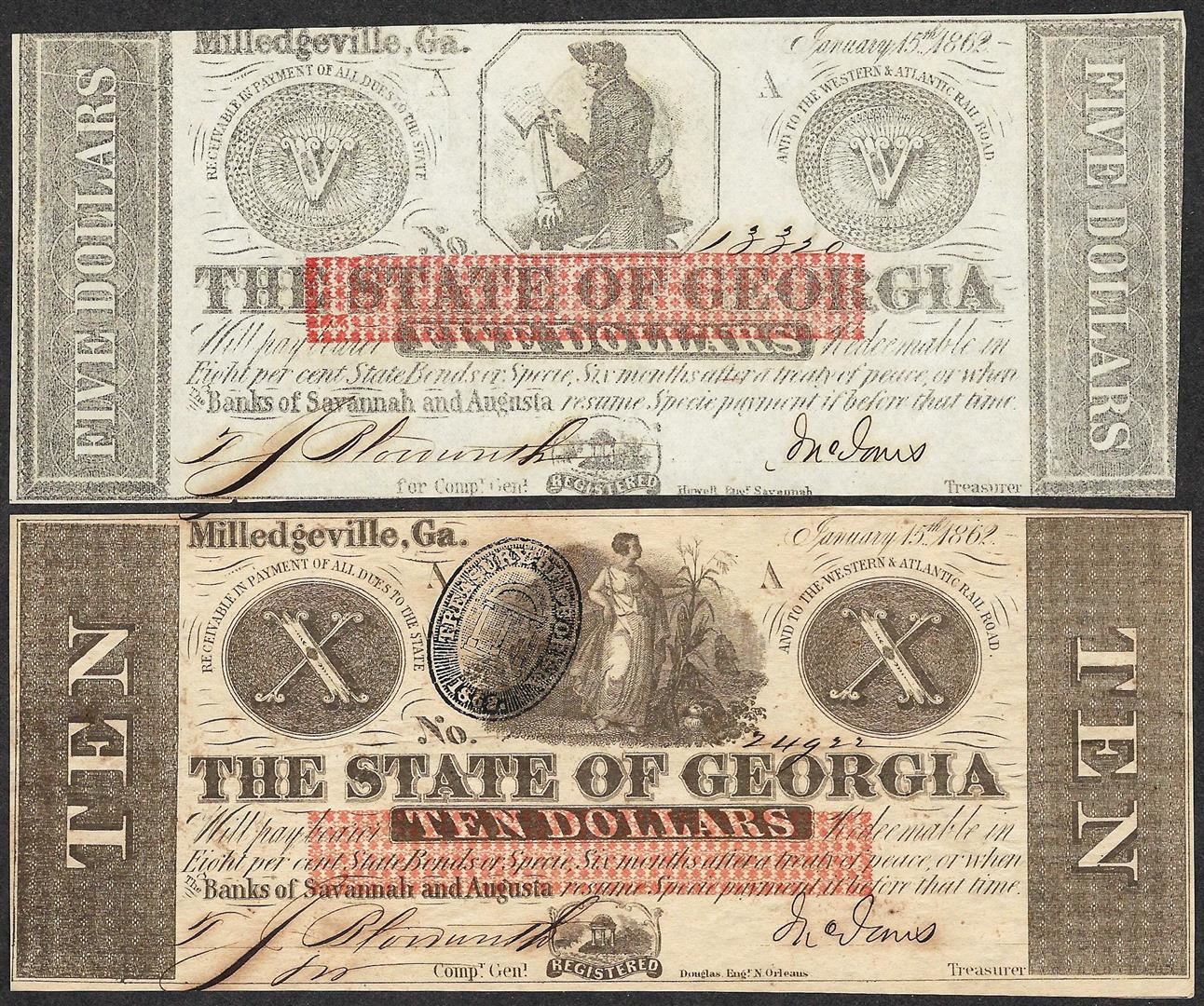 One Lot of 1862 $5 & $10 The State of Georgia Obsolete Note.