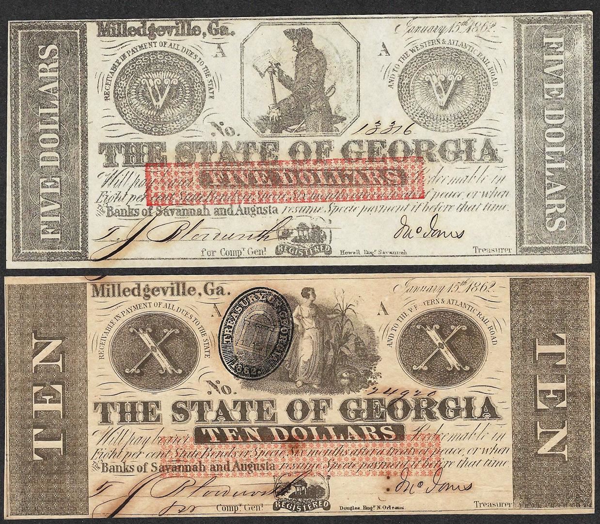 One Lot of 1862 $5 & $10 The State of Georgia Obsolete Note.