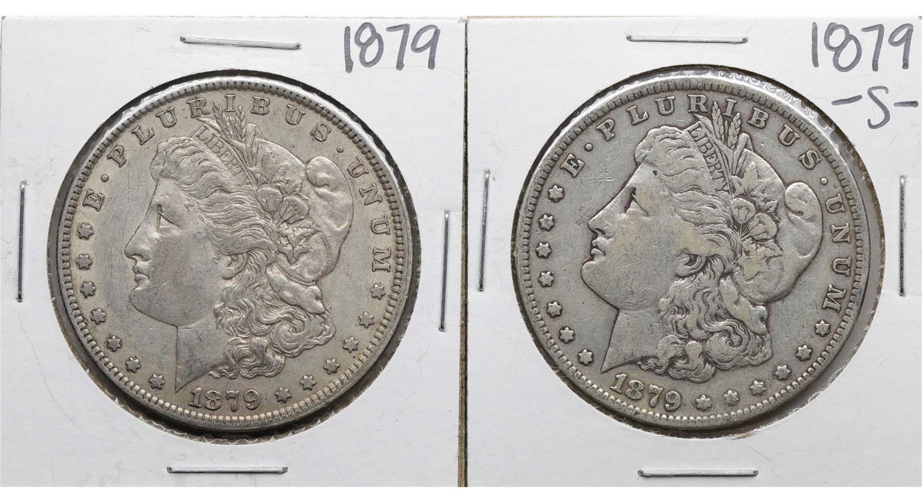 One Lot of 1879-S & 1879 $1 Morgan Silver Dollar Coins.