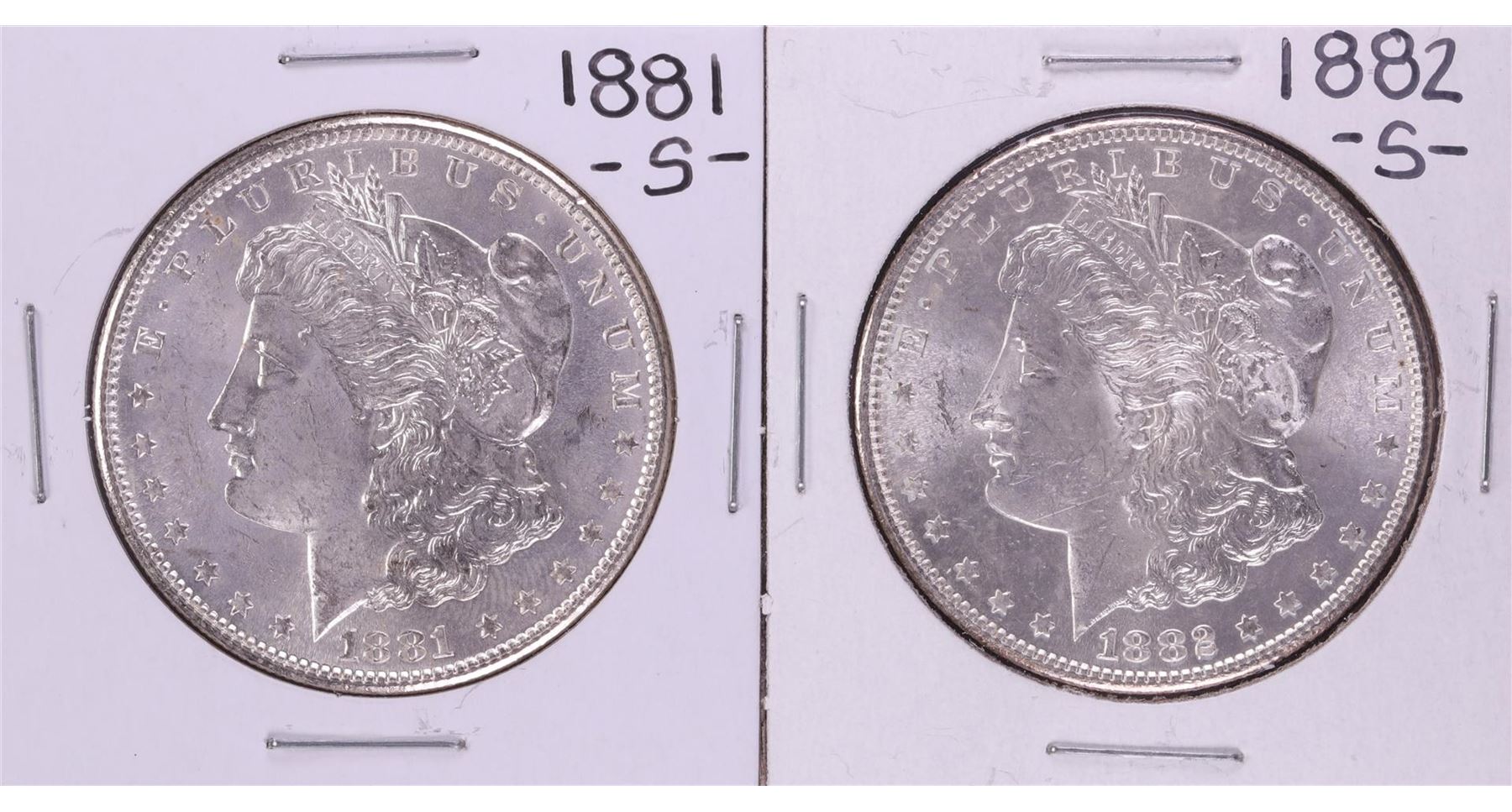 One Lot of 1881-S & 1882-S $1 Morgan Silver Dollar Coins.