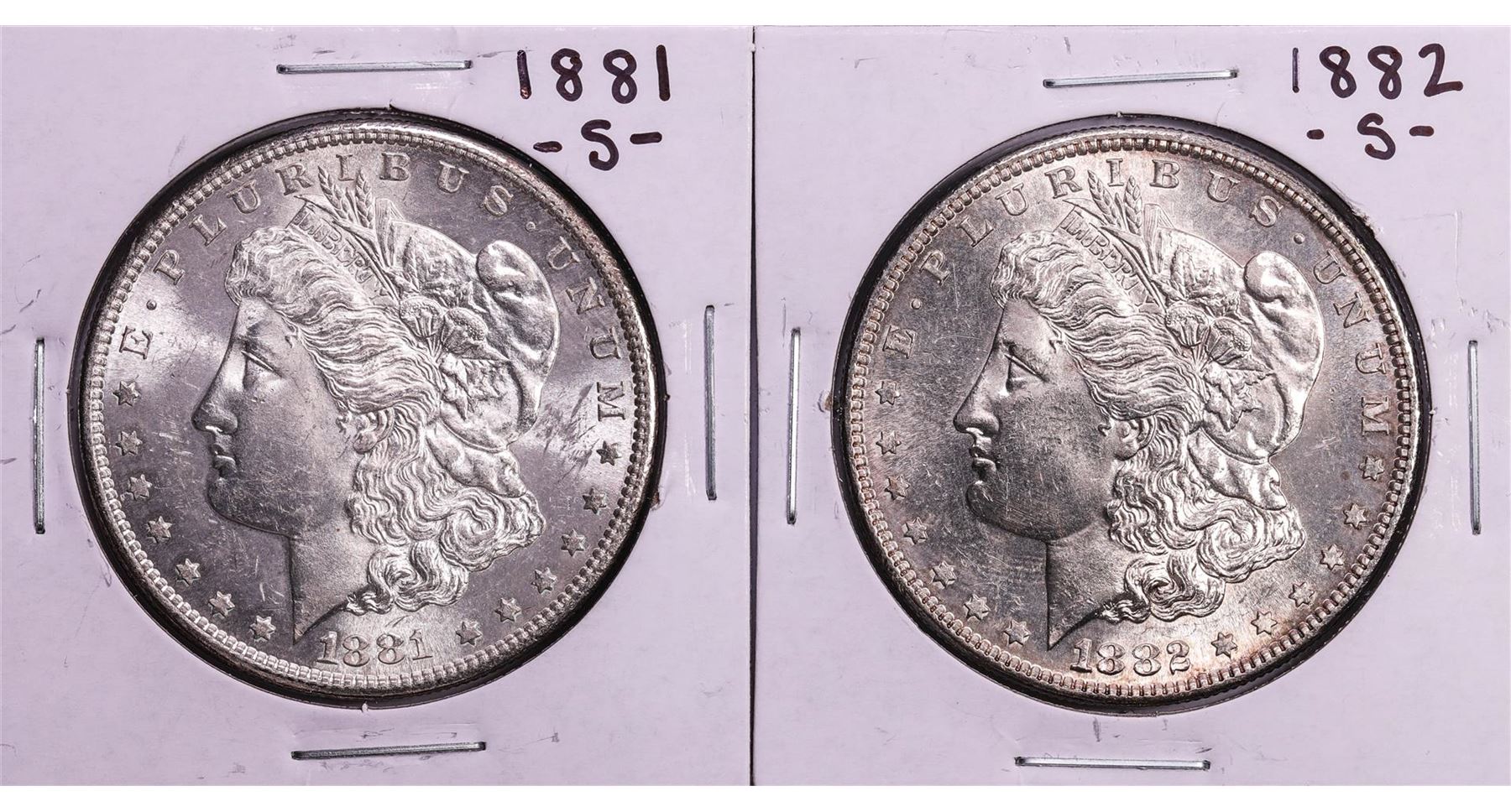 One Lot of 1881-S & 1882-S $1 Morgan Silver Dollar Coins.