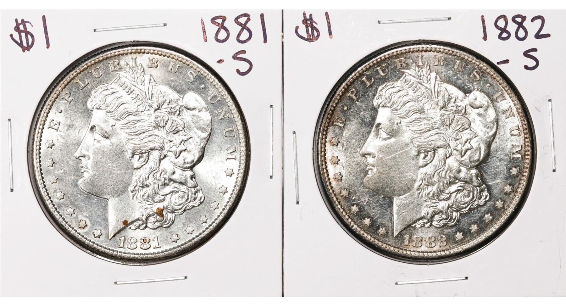 One Lot of 1881-S & 1882-S $1 Morgan Silver Dollar Coins.