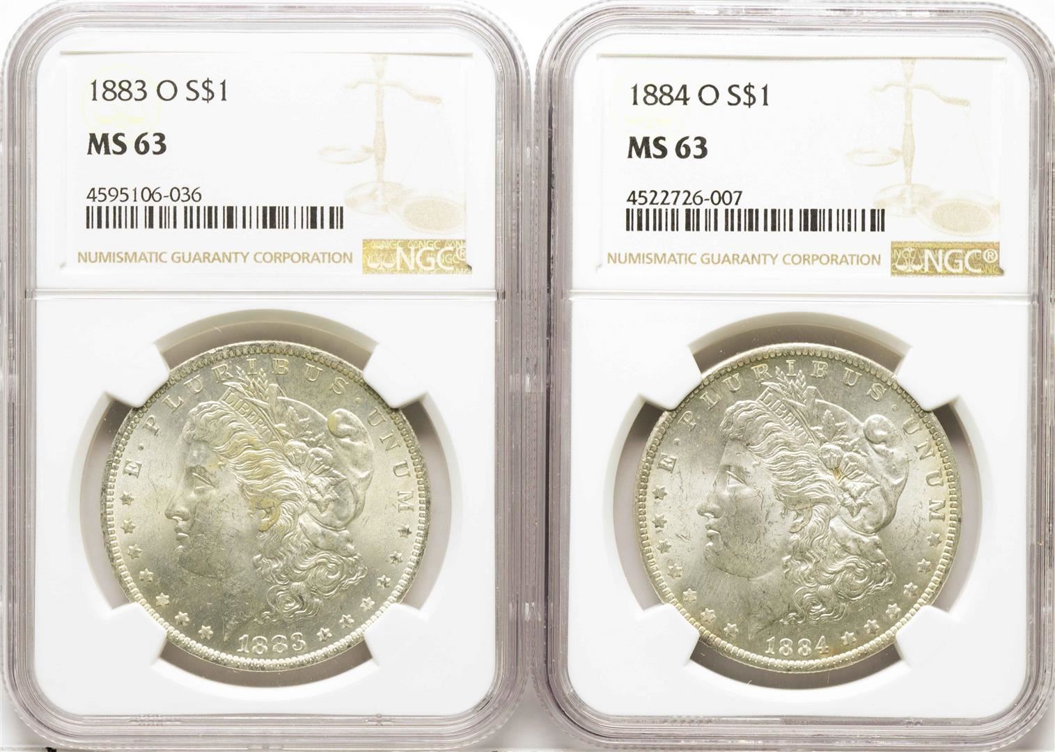 One Lot of 1883-O & 1884-O $1 Morgan Silver Dollar Coins NGC MS63. NGC Certified.