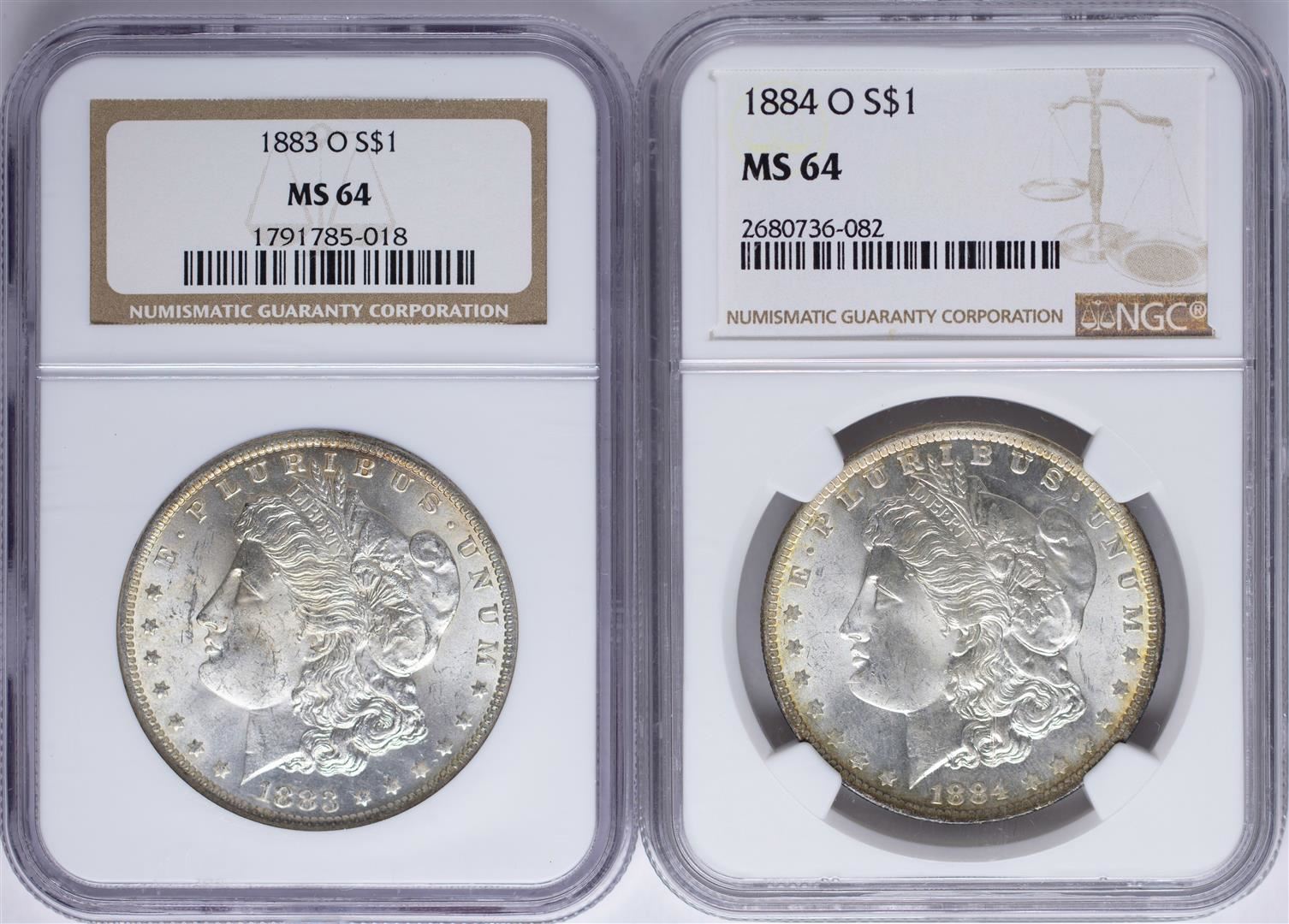 One Lot of 1883-O & 1884-O $1 Morgan Silver Dollar Coins NGC MS64. NGC Certified.