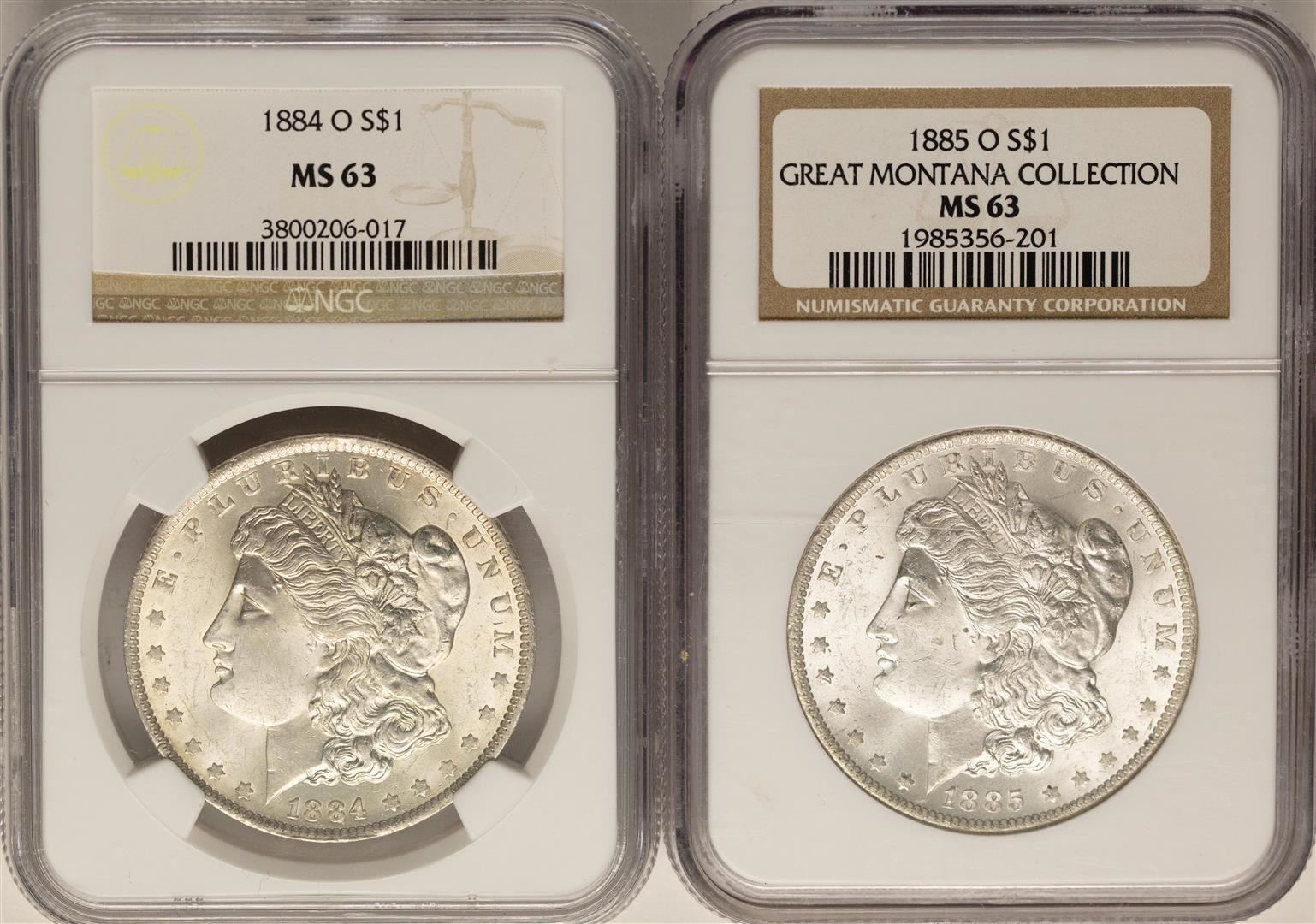 One Lot of 1884-O & 1885-O $1 Morgan Silver Dollar Coins NGC MS63. NGC Certified.
