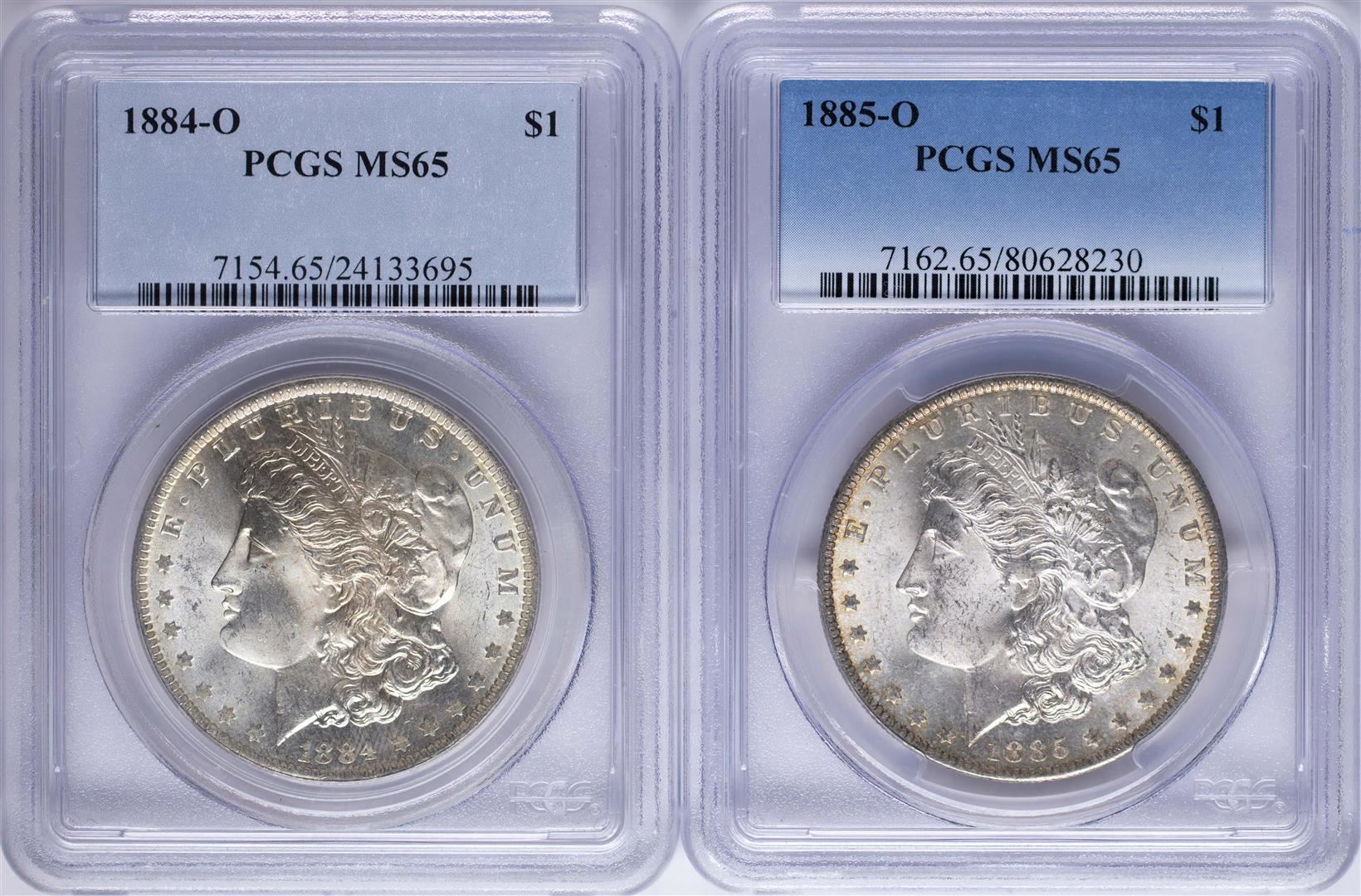 One Lot of 1884-O & 1885-O $1 Morgan Silver Dollar Coins PCGS MS65. PCGS Graded.