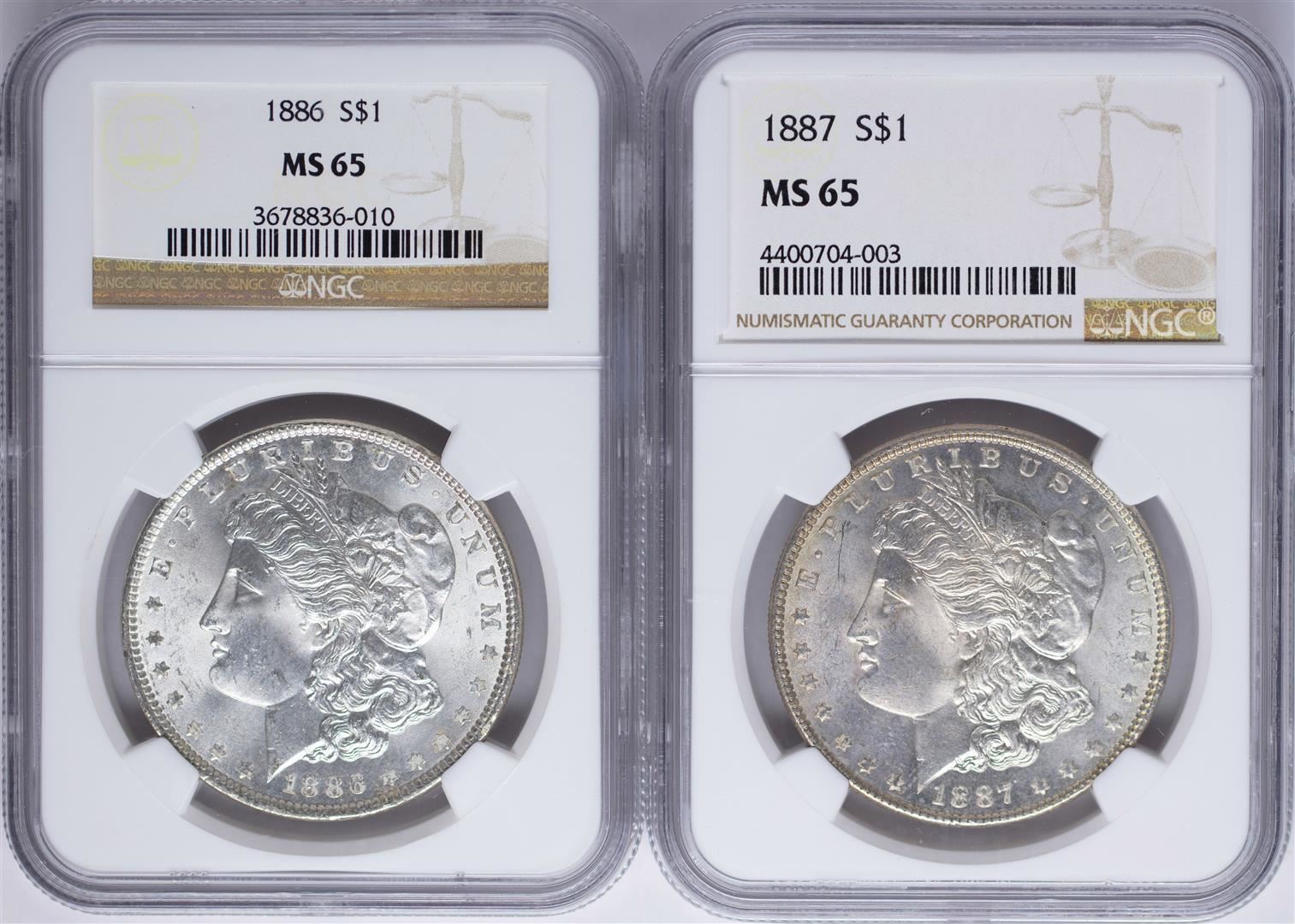 One Lot of 1886-1887 $1 Morgan Silver Dollar Coins NGC MS65. NGC Certified.