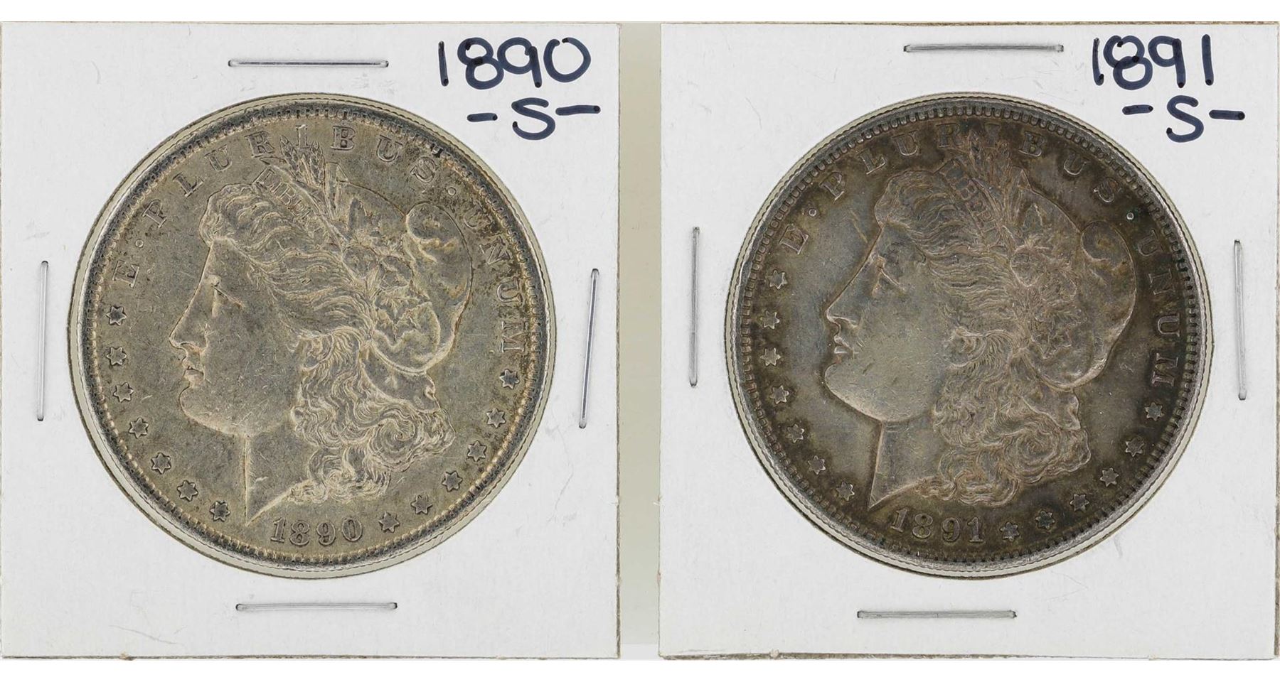 One Lot of 1890-S & 1891-S $1 Morgan Silver Dollar Coins.
