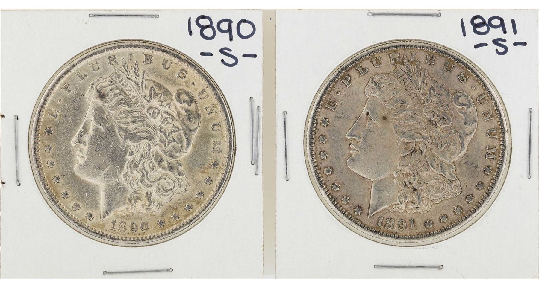 One Lot of 1890-S & 1891-S $1 Morgan Silver Dollar Coins.