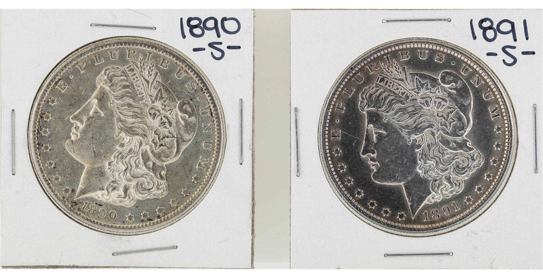 One Lot of 1890-S & 1891-S $1 Morgan Silver Dollar Coins.