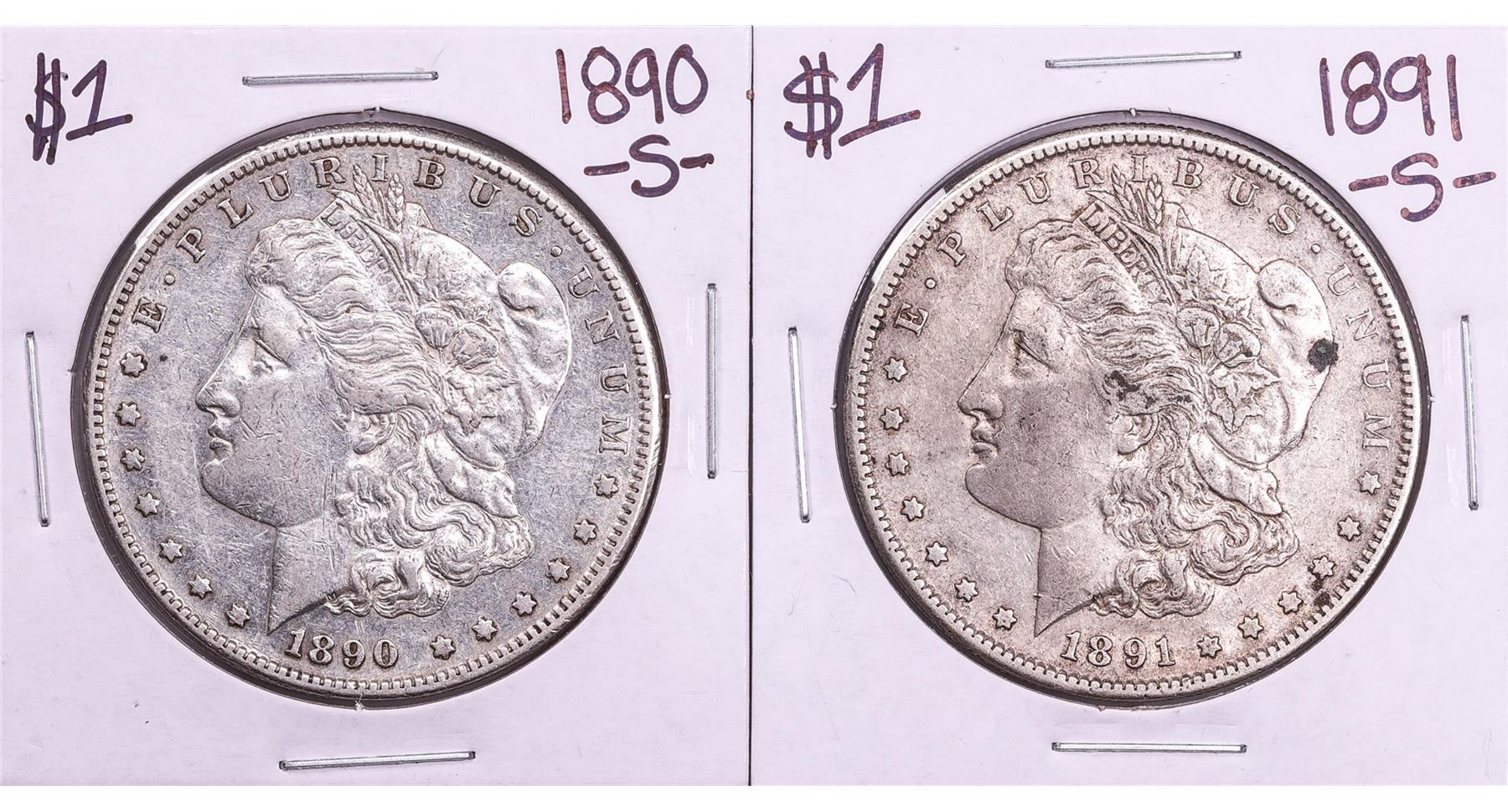 One Lot of 1890-S & 1891-S $1 Morgan Silver Dollar Coins.
