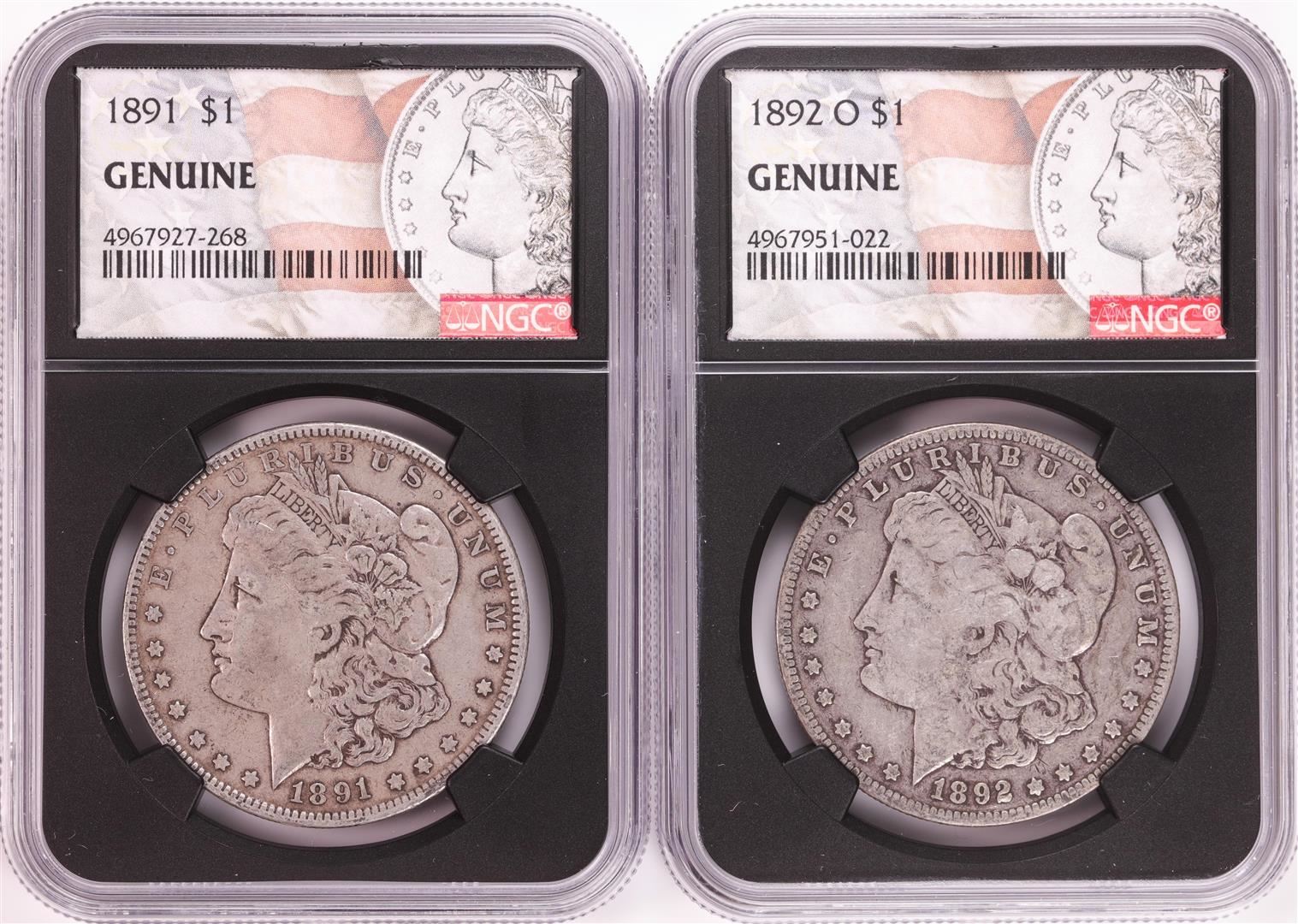 One Lot of 1891 & 1892-O $1 Morgan Silver Dollar Coins NGC Genuine. NGC Certified.