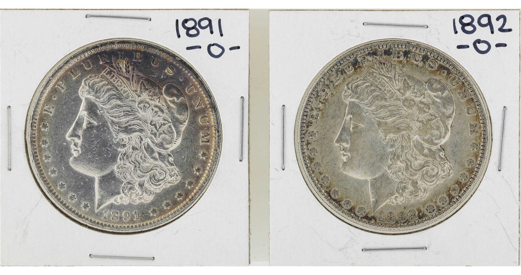 One Lot of 1891-O & 1892-O $1 Morgan Silver Dollar Coins.
