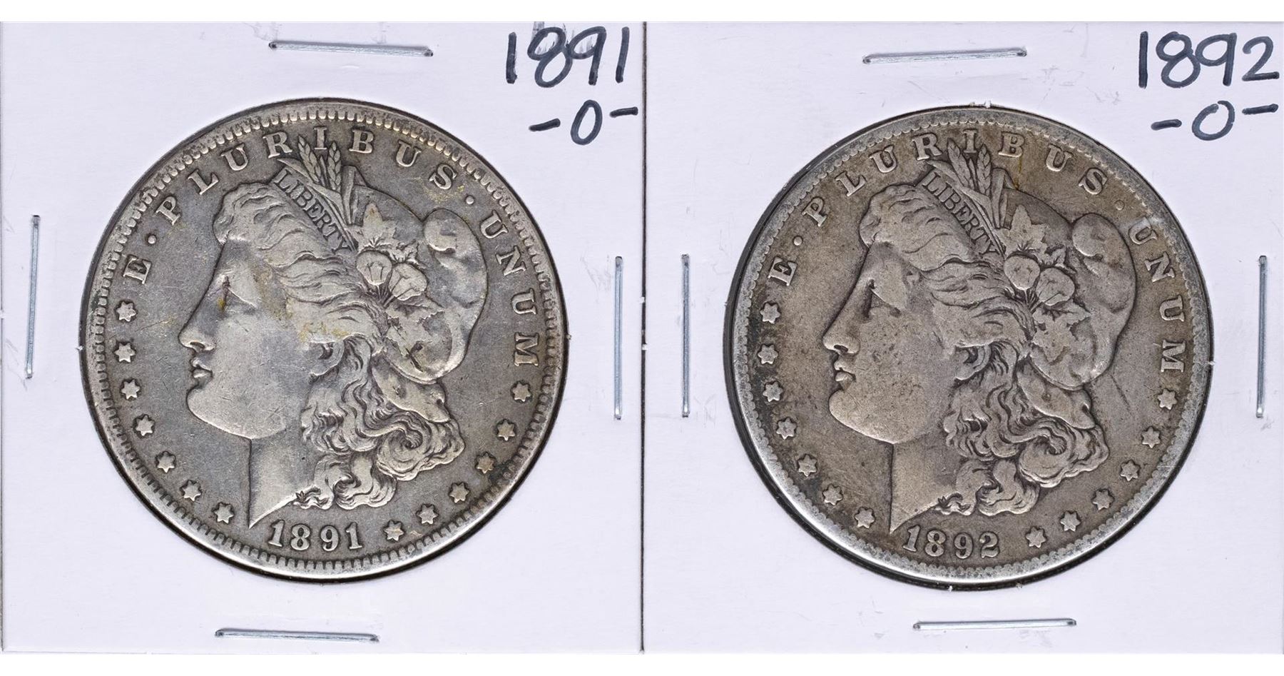 One Lot of 1891-O & 1892-O $1 Morgan Silver Dollar Coins.