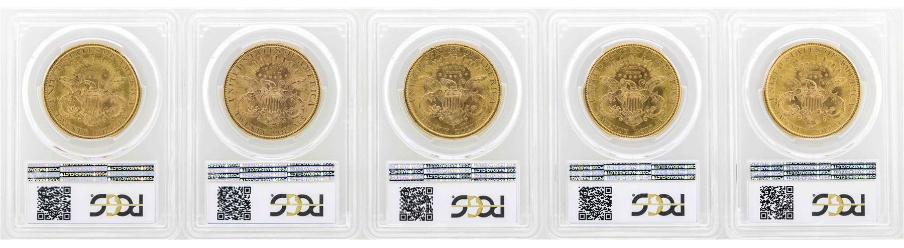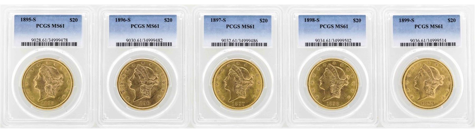 One Lot of 1895-S to 1899-S $20 Liberty Head Double Eagle Gold Coins PCGS MS61. PCGS Graded.