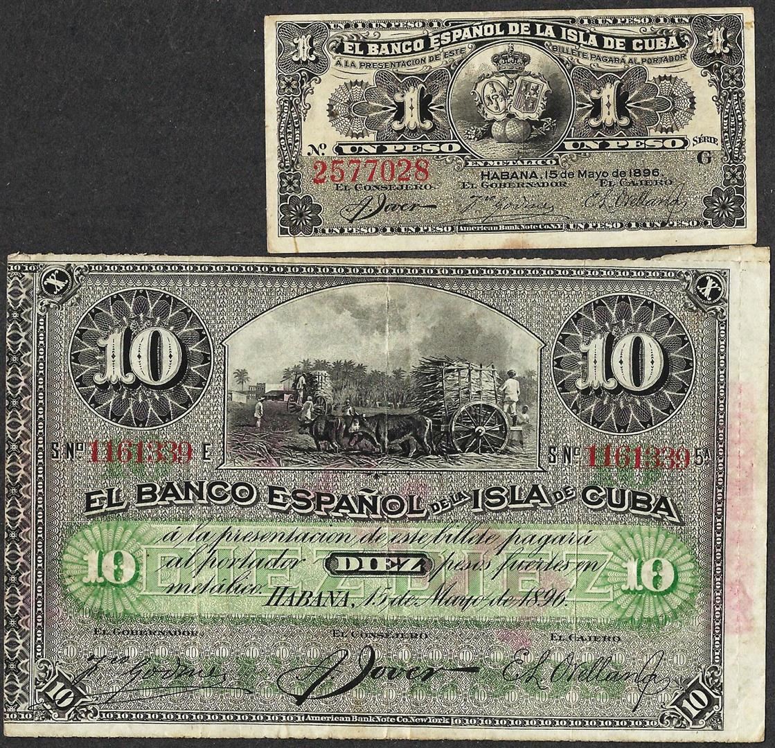 One Lot of 1896 Cuba Un & Diez Pesos Currency Notes.