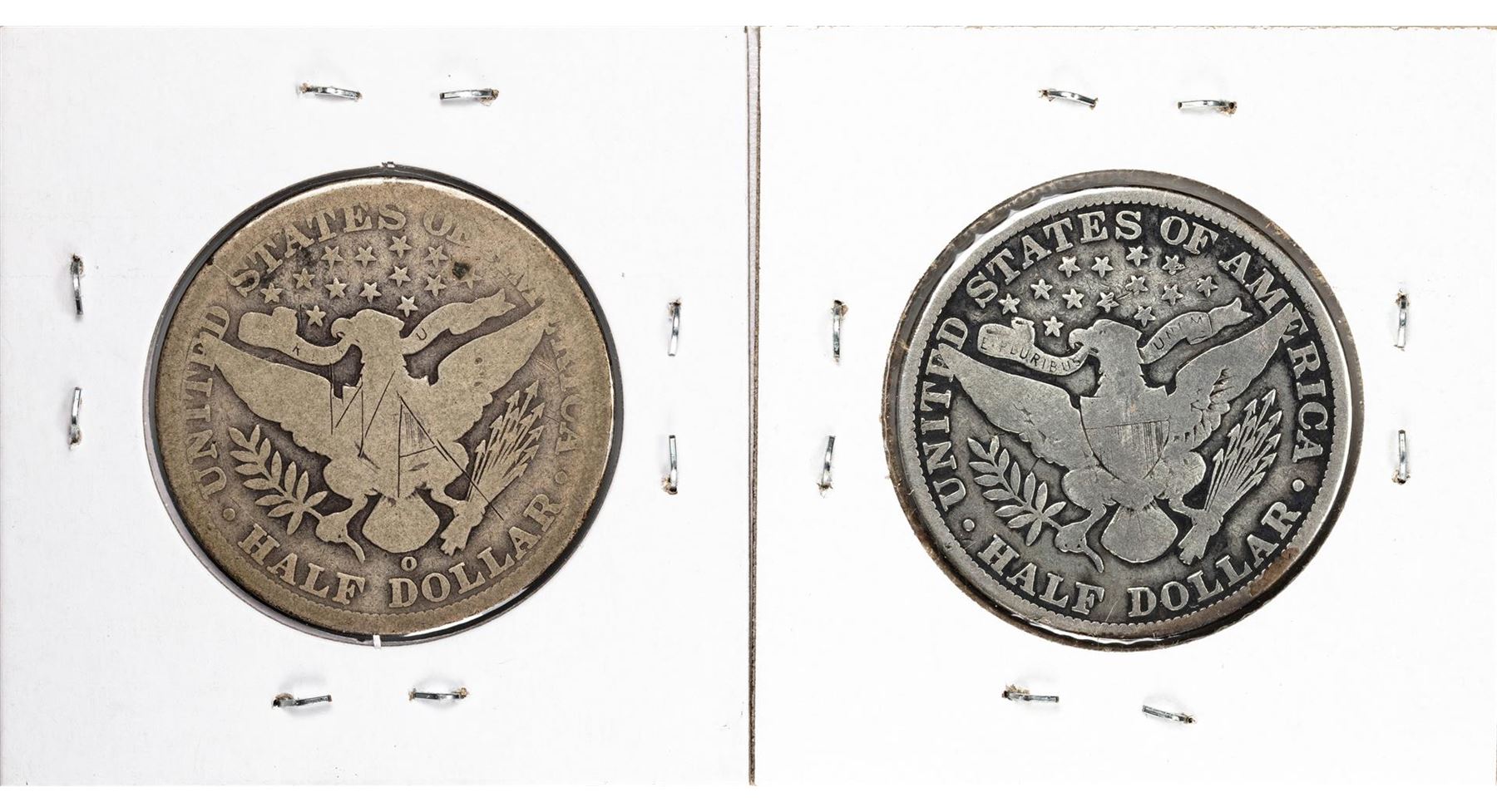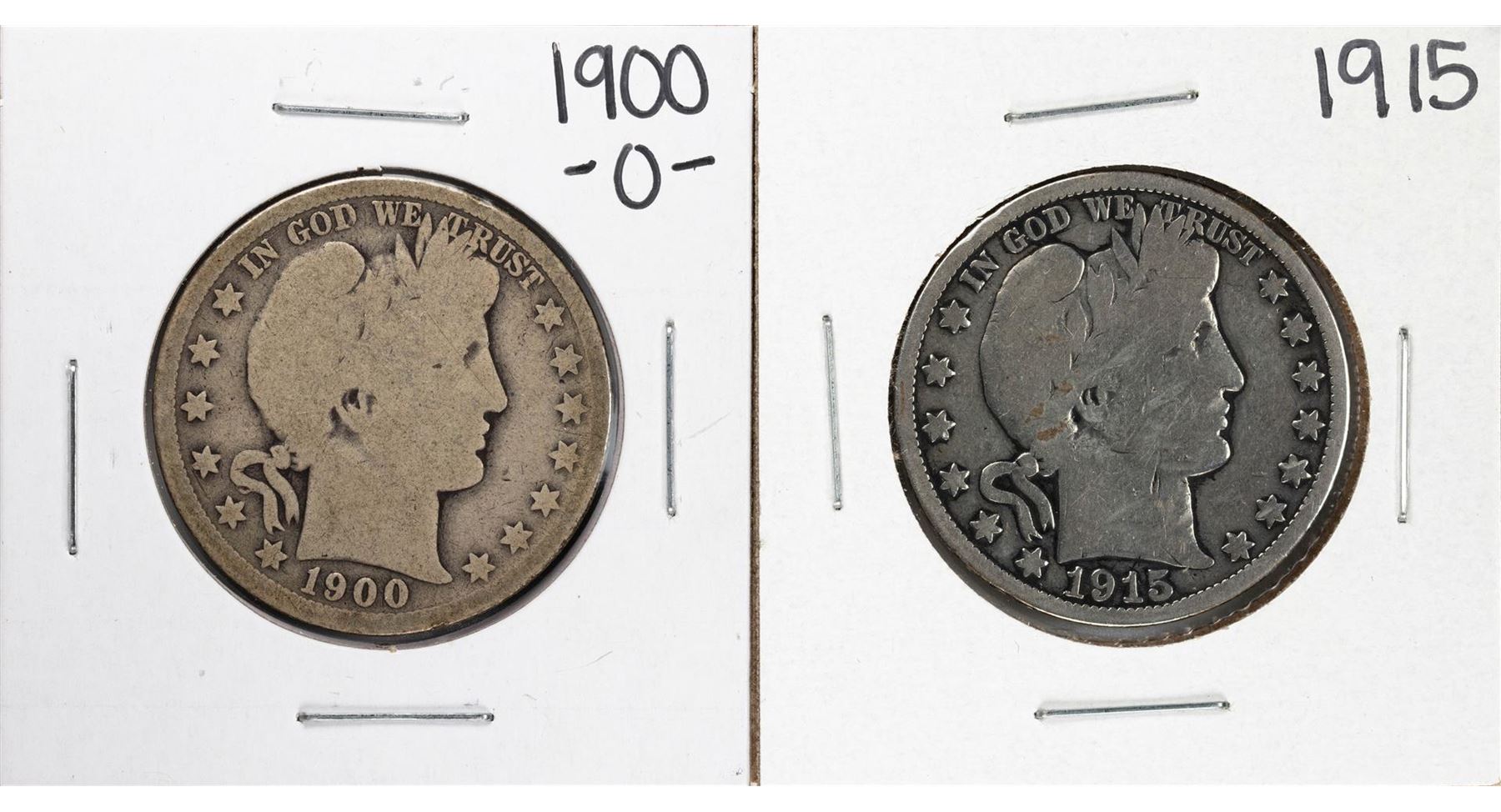 One Lot of 1900-O and 1915 Barber Half Dollar Coins.