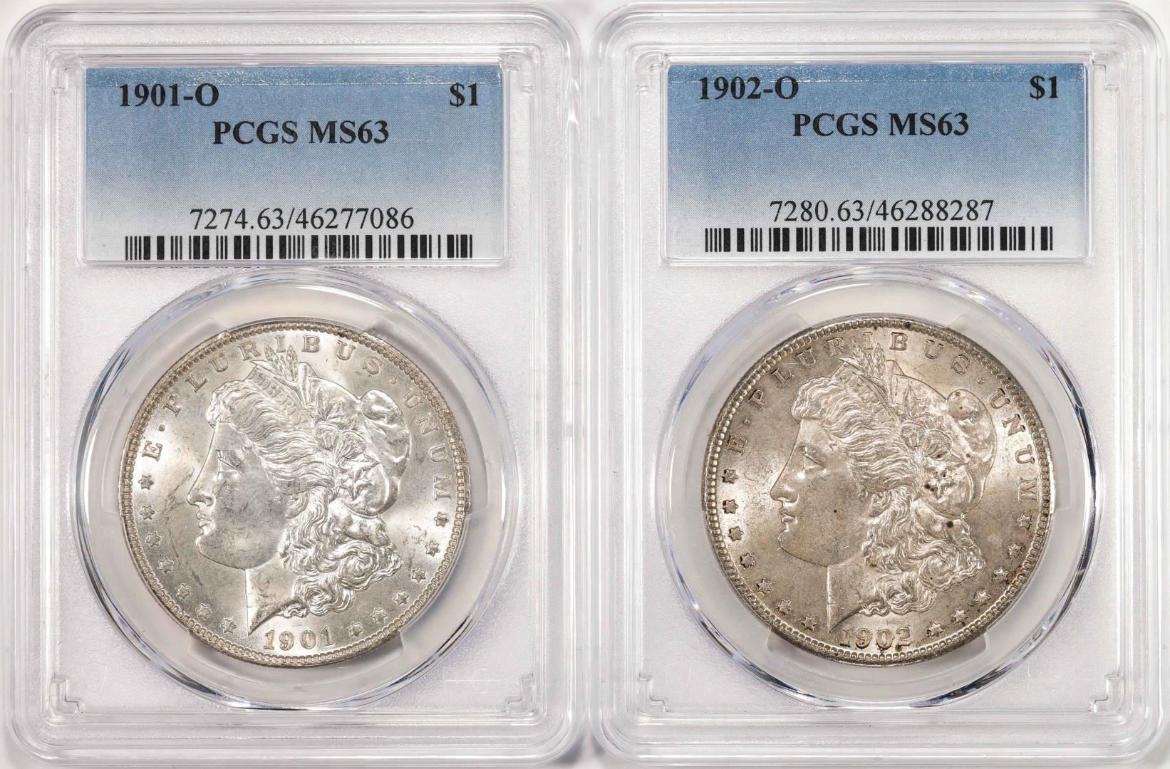 One Lot of 1901-O & 1902-O $1 Morgan Silver Dollar Coins PCGS MS63. PCGS Graded.